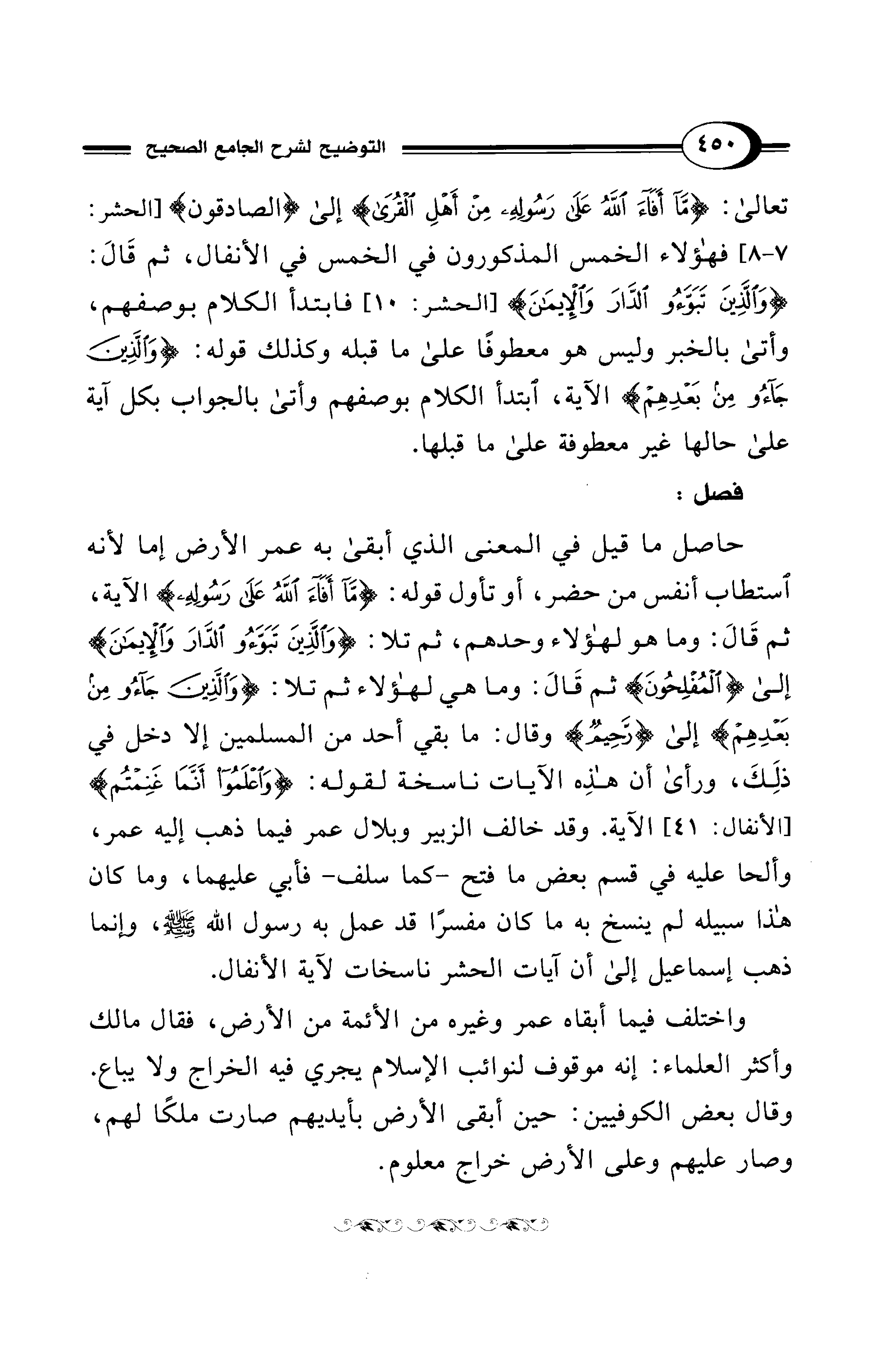 حاصل ما قيل في المعنى الذي أبقى به عمر الأرض إما لأنه استطاب أنفس من حضر، أو تأول قوله: {مَا أَفَاءَ الله عَلَى رَسُولِهِ} الآية، ثم قَالَ: وما هو لهؤلاء وحدهم، ثم تلا: {وَالَّذِينَ تَبَوَّءُوا الدَّارَ وَالْإِيمَانَ} إلى {الْمُفْلِحُونَ} ثم قَالَ: وما هي لهؤلاء ثم تلا: {وَالَّذِينَ جَاءُوا مِنْ بَعْدِهِمْ} إلى {رَحِيمٌ} وقال: ما بقي أحد من المسلمين إلا دخل في ذلِكَ، ورأى أن هذِه الآيات ناسخة لقوله: {وَاعْلَمُوا أَنَّمَا غَنِمْتُمْ} [الأنفال: 41] الآية. وقد خالف الزبير وبلال عمر فيما ذهب إليه عمر، وألحا عليه في قسم بعض ما فتح -كما سلف- فأبي عليهما، وما كان هذا سبيله لم ينسخ به ما كان مفسرًا قد عمل به رسول الله - صلى الله عليه وسلم -، وإنما ذهب إسماعيل إلى أن آيات الحشر ناسخات لآية الأنفال.
