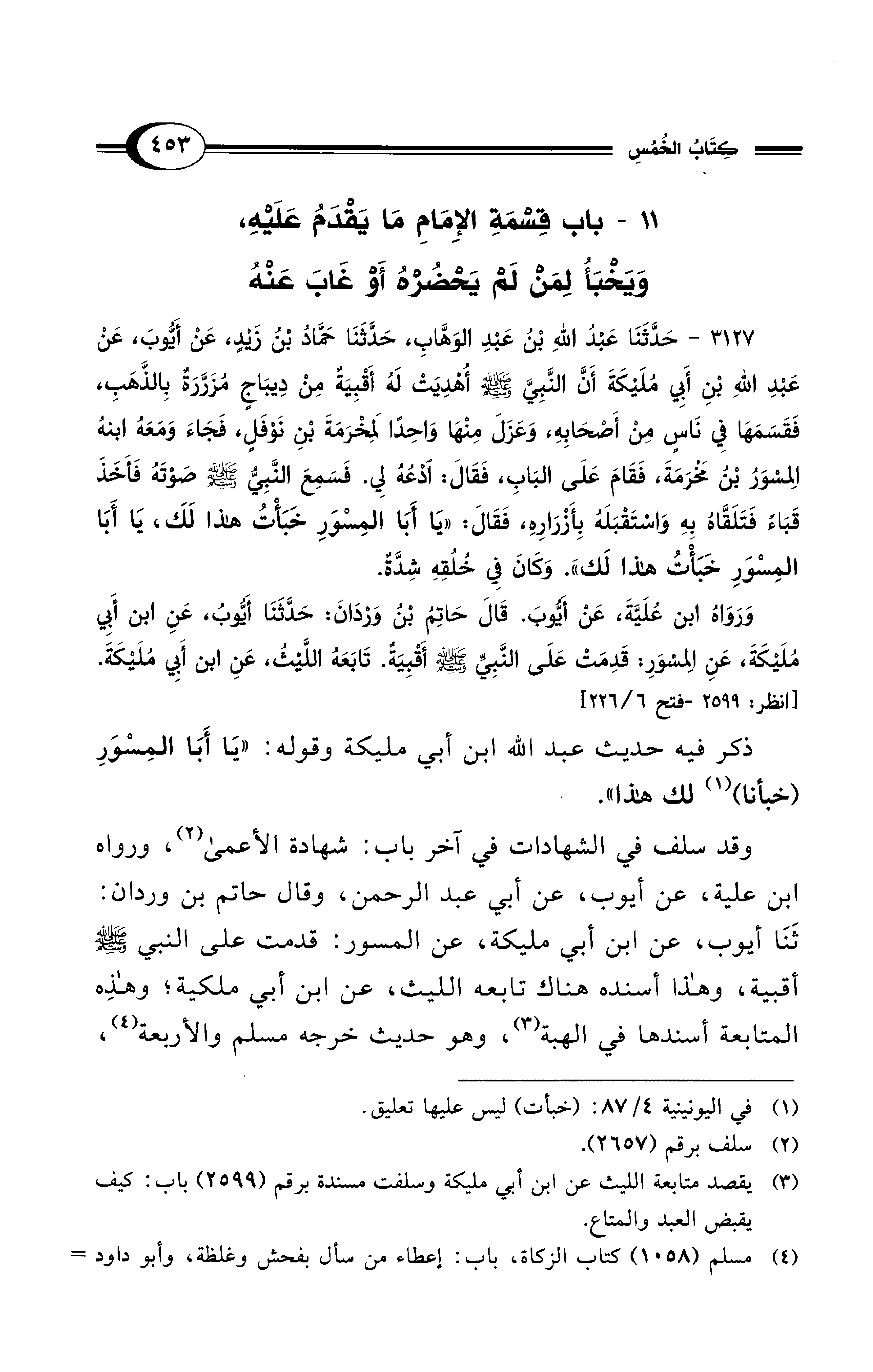 3127 - ثَنَا عَبْدُ اللهِ بْنُ عَبْدِ الوَهَّابِ، حَدَّثَنَا حَمَّادُ بْنُ زَيْدٍ، عَنْ أَيُّوبَ، عَنْ عَبْدِ اللهِ بْنِ أَبِي مُلَيْكَةَ، أَنَّ النَّبِيَّ - صلى الله عليه وسلم - أُهْدِيَتْ لَهُ أَقْبِيَةٌ مِنْ دِيبَاجٍ مُزَرَّرَةٌ بِالذَّهَبِ، فَقَسَمَهَا فِي نَاسٍ مِنْ أَصْحَابِهِ، وَعَزَلَ مِنْهَا وَاحِدًا لِمَخْرَمَةَ بْنِ نَوْفَلٍ، فَجَاءَ وَمَعَهُ ابْنُهُ المِسْوَرُ بْنُ مَخْرَمَةَ، فَقَامَ عَلَى البَابِ فَقَالَ: ادْعُهُ لِي. فَسَمِعَ النَّبِيُّ - صلى الله عليه وسلم - صَوْتَهُ فَأَخَذَ قَبَاءً فَتَلَقَّاهُ بِهِ وَاسْتَقْبَلَهُ بِأَزْرَارِهِ فَقَالَ: «يَا أَبَا الْمِسْوَرِ، خَبَأْتُ هَذَا لَكَ، يَا أَبَا المِسْوَرِ، خَبَأْتُ هَذَا لَكَ». وَكَانَ فِي خُلُقِهِ شِدَّةٌ.
