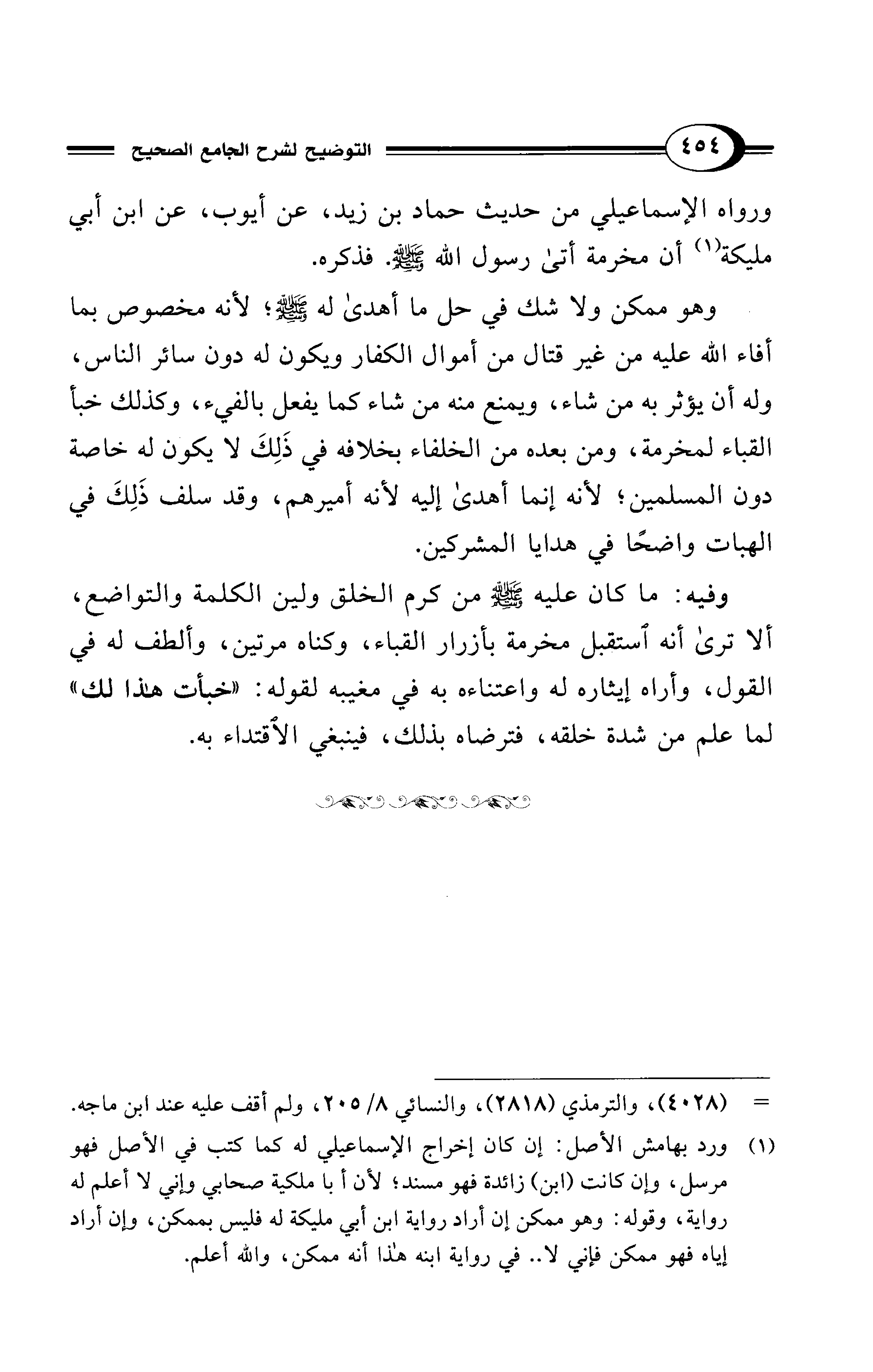(¬1) ورد بهامش الأصل: إن كان إخراج الإسماعيلي له كما كتب في الأصل فهو مرسل، وإن كانت (ابن) زائدة فهو مسند؛ لأن أبا ملكية صحابي وإني لا أعلم له رواية" وقوله: وهو ممكن إن أراد رواية ابن أبي مليكة له فليس بممكن، وإن أراد إياه فهو ممكن فإني لا .. في رواية ابنه هذا أنه ممكن، والله أعلم.