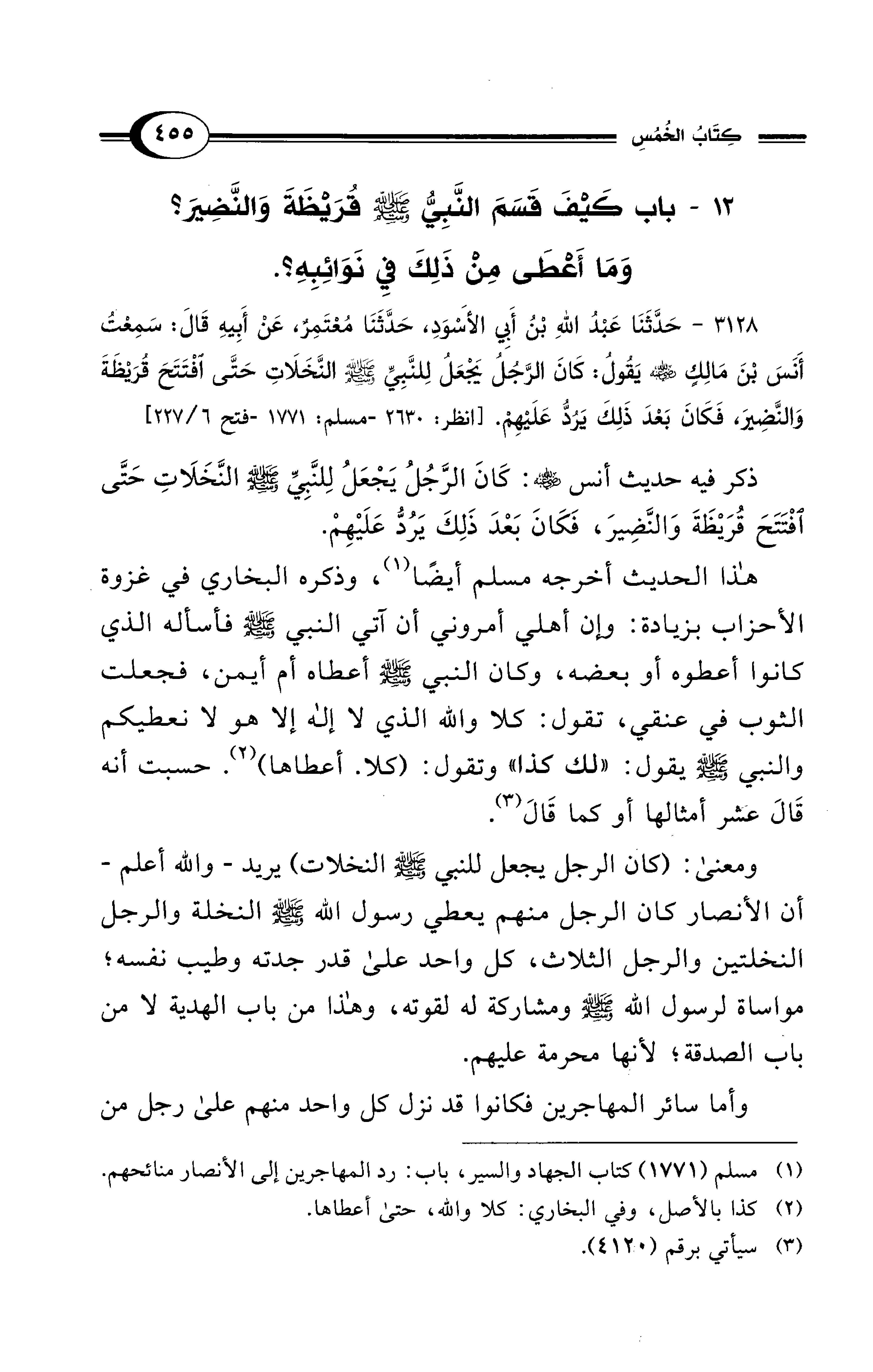 3128 - حَدَّثَنَا عَبْدُ اللهِ بْنُ أَبِي الأَسْوَدِ، حَدَّثَنَا مُعْتَمِرٌ، عَنْ أَبِيهِ قَالَ: سَمِعْتُ أَنَسَ بْنَ مَالِكٍ - رضي الله عنه - يَقُولُ: كَانَ الرَّجُلُ يَجْعَلُ لِلنَّبِيِّ - صلى الله عليه وسلم - النَّخَلاَتِ حَتَّى افْتَتَحَ قُرَيْظَةَ وَالنَّضِيرَ، فَكَانَ بَعْدَ ذَلِكَ يَرُدُّ عَلَيْهِمْ. [انظر: 2630 - مسلم: 1771 - فتح 6/ 227]