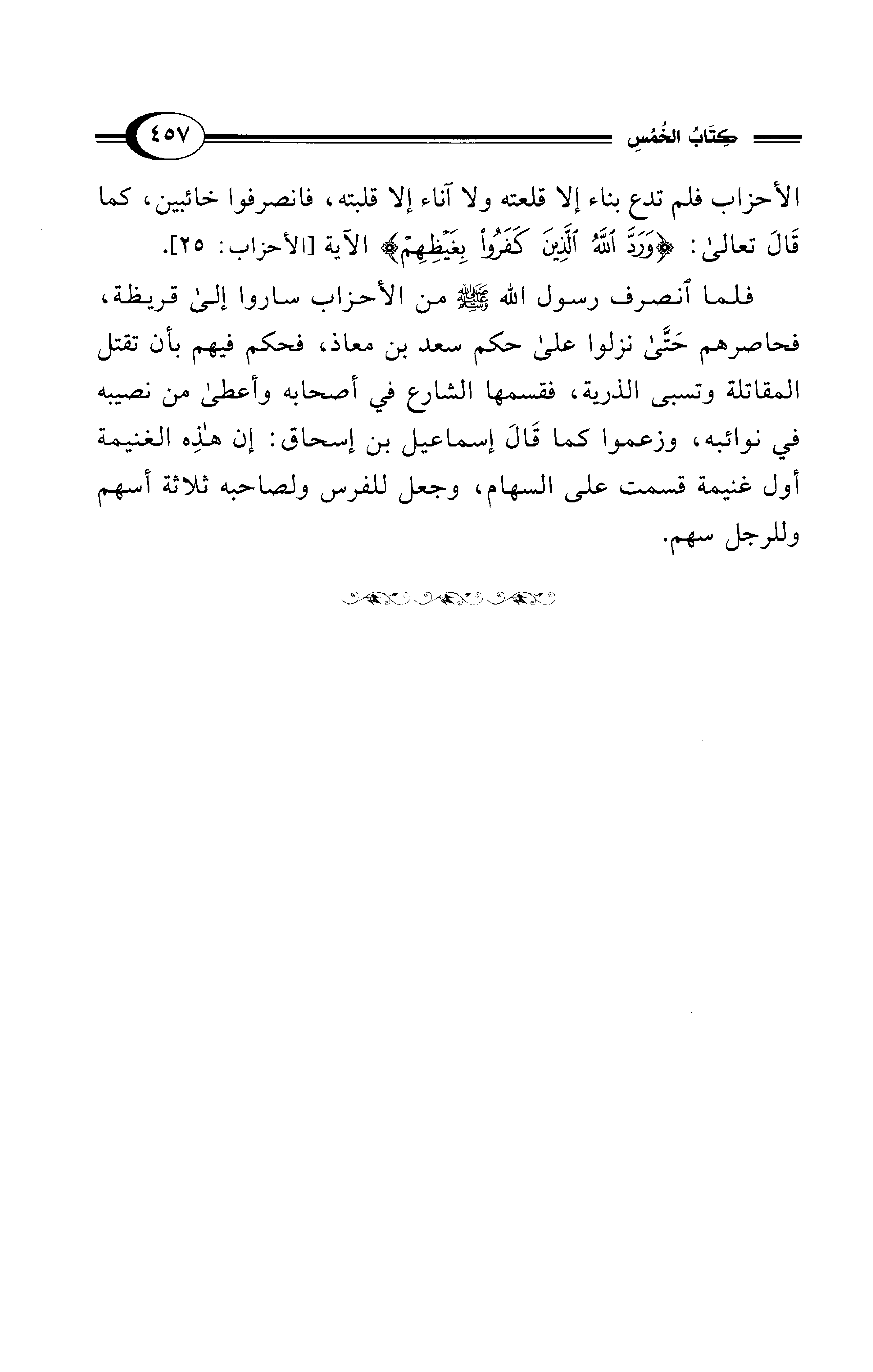 فلما انصرف رسول الله - صلى الله عليه وسلم - من الأحزاب ساروا إلى قريظة، فحاصرهم حَتَّى نزلوا على حكم سعد بن معاذ، فحكم فيهم بأن تقتل المقاتلة وتسبى الذرية، فقسمها الشارع في أصحابه وأعطى من نصيبه في نوائبه، وزعموا كما قَالَ إسماعيل بن إسحاق: إن هذِه الغنيمة أول غنيمة قسمت على السهام، وجعل للفرس ولصاحبه ثلاثة أسهم وللرجل سهم.