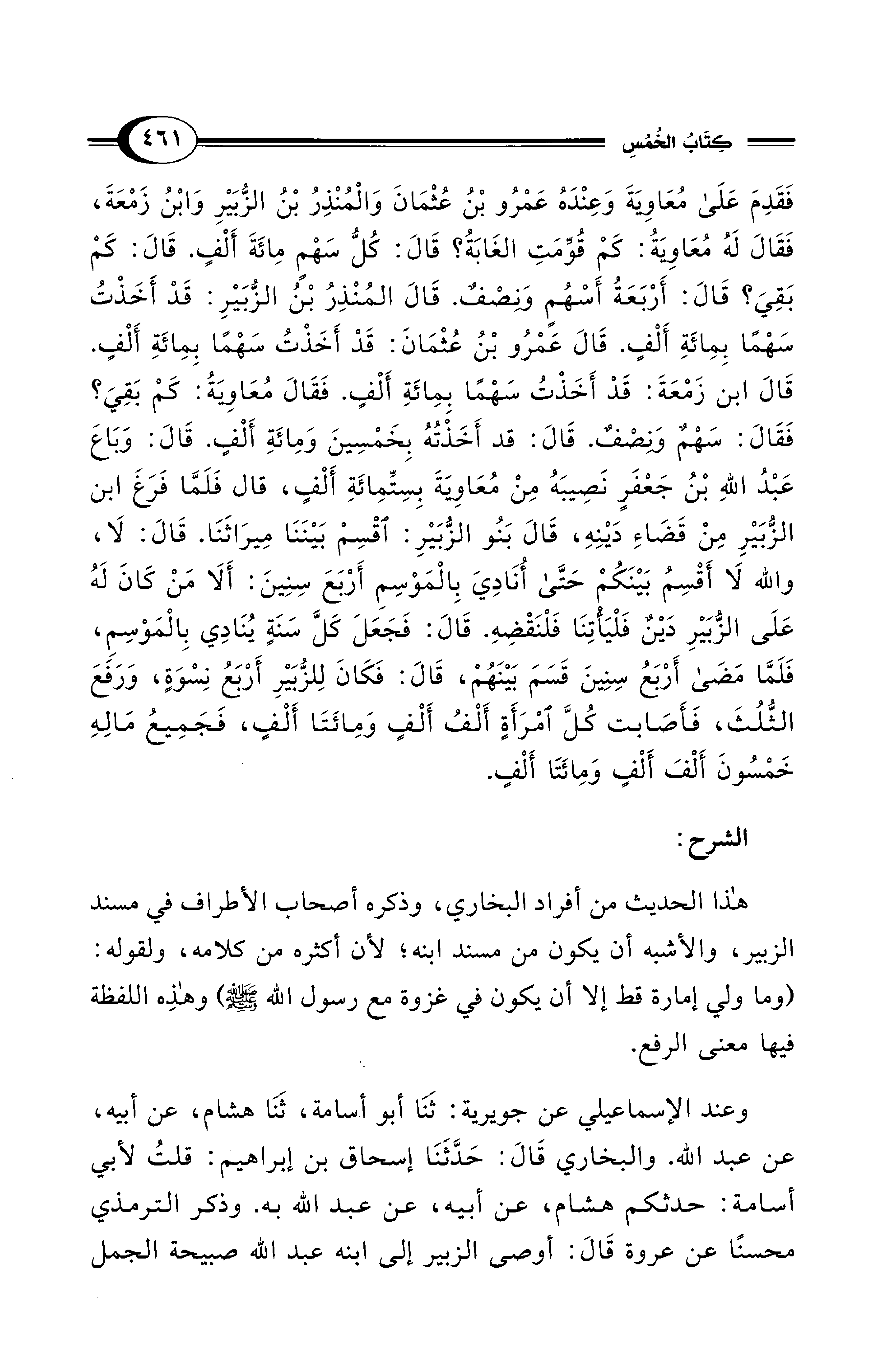 فَقَدِمَ عَلَى مُعَاوِيَةَ وَعِنْدَهُ عَمْرُو بْنُ عُثْمَانَ وَالْمُنْذِرُ بْنُ الزُّبَيْرِ وَابْنُ زَمْعَةَ، فَقَالَ لَهُ مُعَاوِيَةُ: كَمْ قُوِّمَتِ الغَابَةُ؟ قَالَ: كُلُّ سَهْمٍ مِائَةَ أَلْفٍ. قَالَ: كَمْ بَقِيَ؟ قَالَ: أَرْبَعَةُ أَسْهُمٍ وَنِصْفٌ. قَالَ المُنْذِرُ بْنُ الزُّبَيْرِ: قَدْ أَخَذْتُ سَهْمًا بِمِائَةِ أَلْفٍ. قَالَ عَمْرُو بْنُ عُثْمَانَ: قَدْ أَخَذْتُ سَهْمًا بِمِائَةِ أَلْفٍ. قَالَ ابن زَمْعَةَ: قَدْ أَخَذْتُ سَهْمًا بِمِائَةِ أَلْفٍ. فَقَالَ مُعَاوِيَةُ: كَمْ بَقِيَ؟ فَقَالَ: سَهْمٌ وَنِصْفٌ. قَالَ: قد أَخَذْتُهُ بِخَمْسِينَ وَمِائَةِ أَلْفٍ. قَالَ: وَبَاعَ عَبْدُ اللهِ بْنُ جَعْفَرٍ نَصِيبَهُ مِنْ مُعَاوِيَةَ بِسِتِّمِائَةِ أَلْفٍ، قال فَلَمَّا فَرَغَ ابن الزُّبَيْرِ مِنْ قَضَاءِ دَيْنِهِ، قَالَ بَنُو الزُّبَيْرِ: اقْسِمْ بَيْنَنَا مِيرَاثَنَا. قَالَ: لَا، والله لَا أَقْسِمُ بَيْنَكُمْ حَتَّى أُنَادِيَ بِالْمَوْسمِ أَرْبَعَ سِنِينَ: أَلَا مَنْ كَانَ لَهُ عَلَى الزُّبَيْرِ دَيْن فَلْيَاتِنَا فَلْنَقْضِهِ. قَالَ: فَجَعَلَ كَلَّ سَنَةٍ يُنَادِي بِالْمَوْسِمِ، فَلَمَّا مَضى أَرْبَعُ سِنِينَ قَسَمَ بَيْنَهُمْ، قَالَ: فَكَانَ لِلزُّبَيْرِ أَرْبَعُ نِسْوَةٍ، وَرَفَعَ الثُّلُثَ، فَأَصَابت كُلَّ امْرَأَةٍ أَلْفُ أَلْفٍ وَمِائَتَا أَلْفٍ، فَجَمِيعُ مَالِهِ خَمْسُونَ أَلْفَ أَلْفٍ وَمِائَتَا أَلْفٍ.