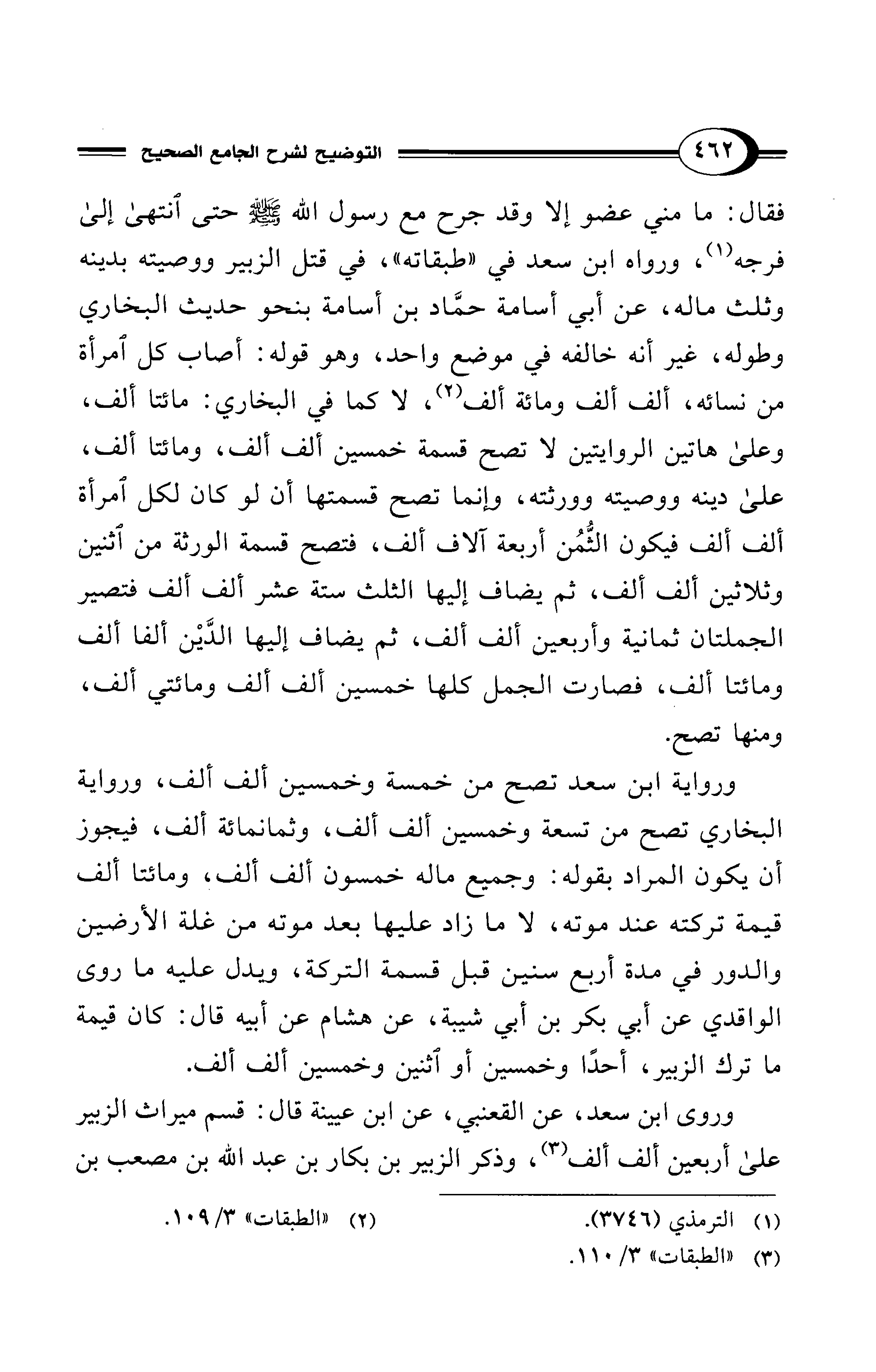 فقال: ما مني عضو إلا وقد جرح مع رسول الله - صلى الله عليه وسلم - حتى انتهى إلى فرجه (¬1)، ورواه ابن سعد في "طبقاته"، في قتل الزبير ووصيته بدينه وثلث ماله، عن أبي أسامة حمَّاد بن أسامة بنحو حديث البخاري وطوله، غير أنه خالفه في موضع واحد، وهو قوله: أصاب كل امرأة من نسائه، ألف ألف ومائة ألف (¬2)، لا كما في البخاري: مائتا ألف، وعلى هاتين الروايتين لا تصح قسمة خمسين ألف ألف، ومائتا ألف، على دينه ووصيته وورثته، وإنما تصح قسمتها أن لو كان لكل امرأة ألف ألف فيكون الثُّمُن أربعة آلاف ألف، فتصح قسمة الورثة من اثنين وثلاثين ألف ألف، ثم يضاف إليها الثلث ستة عشر ألف ألف فتصير الجملتان ثمانية وأربعين ألف ألف، ثم يضاف إليها الدَّيْن ألفا ألف ومائتا ألف، فصارت الجمل كلها خمسين ألف ألف ومائتي ألف، ومنها تصح.