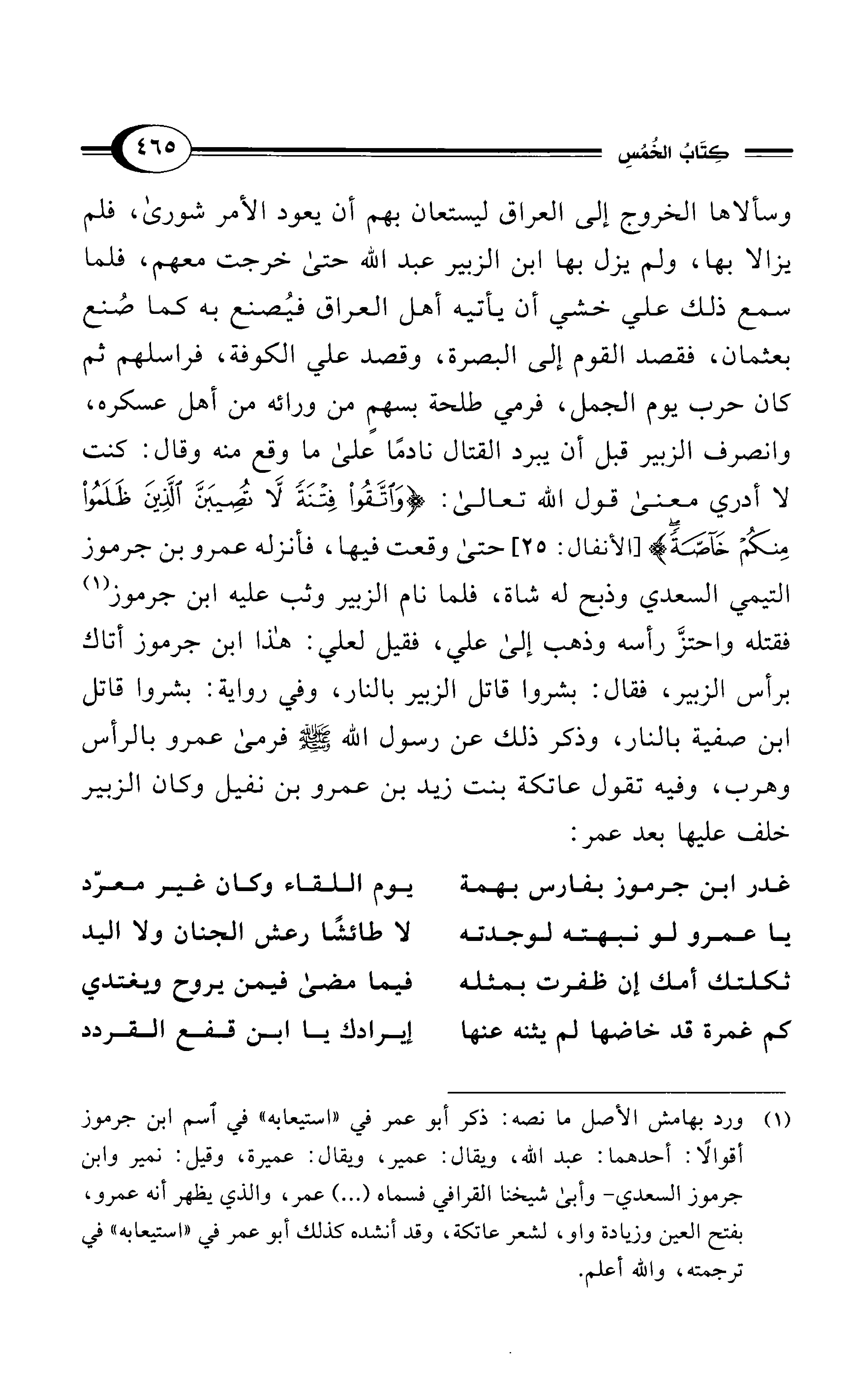 وسألاها الخروج إلى العراق ليستعان بهم أن يعود الأمر شورى، فلم يزالا بها, ولم يزل بها ابن الزبير عبد الله حتى خرجت معهم، فلما سمع ذلك علي خشي أن يأتيه أهل العراق فيُصنع به كما صُنع بعثمان، فقصد القوم إلى البصرة، وقصد علي الكوفة، فراسلهم ثم كان حرب يوم الجمل، فرمي طلحة بسهمٍ من ورائه من أهل عسكره، وانصرف الزبير قبل أن يبرد القتال نادمًا على ما وقع منه وقال: كنت لا أدري معنى قول الله تعالى: {وَاتَّقُوا فِتْنَةً لَا تُصِيبَنَّ الَّذِينَ ظَلَمُوا مِنْكُمْ خَاصَّةً} [الأنفال: 25] حتى وقعت فيها، فأنزله عمرو بن جرموز التيمي السعدي وذبح له شاة، فلما نام الزبير وثب عليه ابن جرموز (¬1) فقتله واحتزَّ رأسه وذهب إلى علي، فقيل لعلي: هذا ابن جرموز أتاك برأس الزبير، فقال: بشروا قاتل الزبير بالنار، وفي رواية: بشروا قاتل ابن صفية بالنار، وذكر ذلك عن رسول الله - صلى الله عليه وسلم - فرمى عمرو بالرأس وهرب، وفيه تقول عاتكة بنت زيد بن عمرو بن نفيل وكان الزبير خلف عليها بعد عمر: