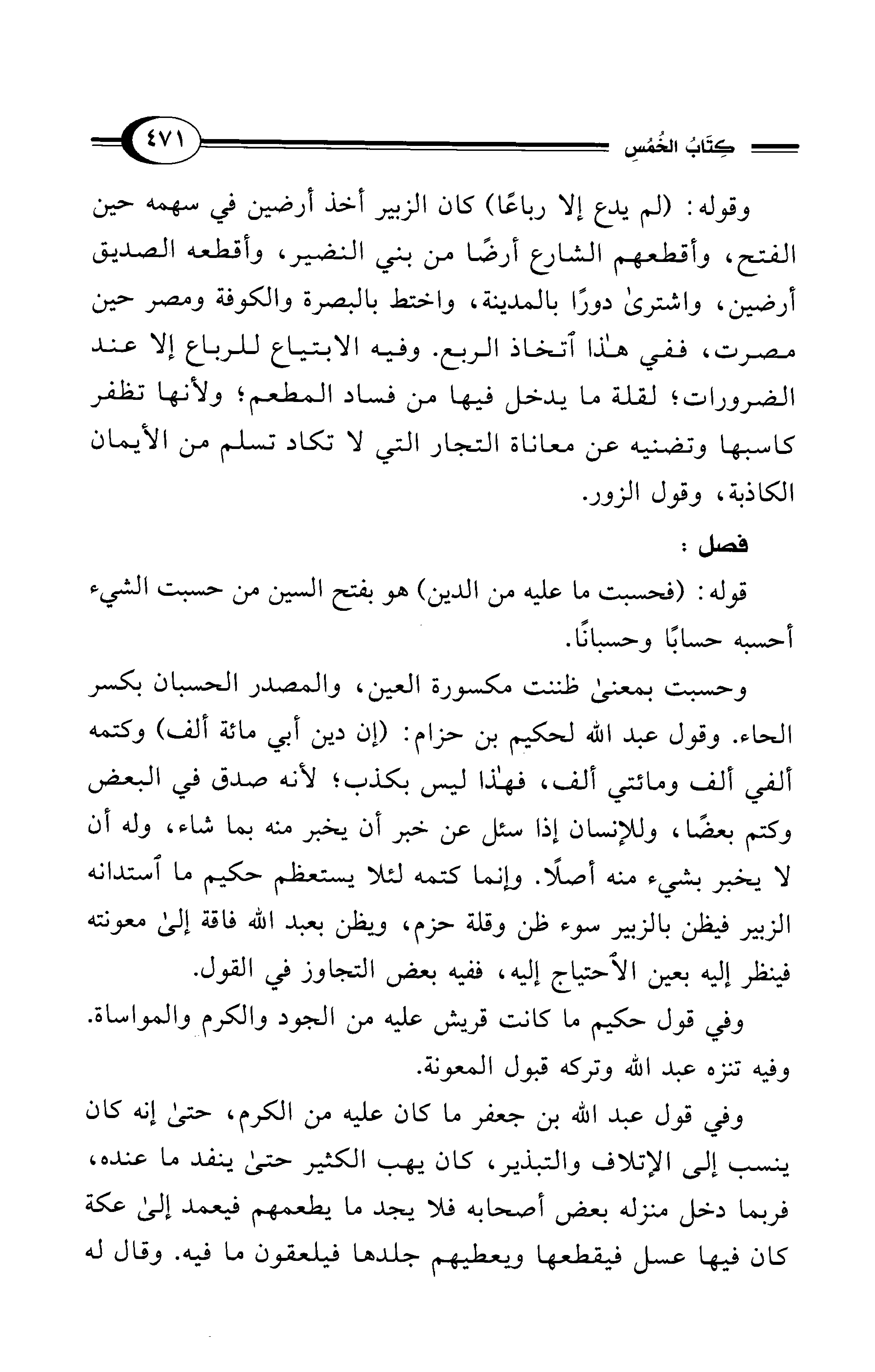 وحسبت بمعنى ظننت مكسورة العين، والمصدر الحسبان بكسر الحاء. وقول عبد الله لحكيم بن حزام: (إن دين أبي مائة ألف) وكتمه ألفي ألف ومائتي ألف، فهذا ليس بكذب؛ لأنه صدق في البعض وكتم بعضًا, وللإنسان إذا سئل عن خبر أن يخبر منه بما شاء، وله أن لا يخبر بشيء منه أصلاً. وإنما كتمه لئلا يستعظم حكيم ما استدانه الزبير فيظن بالزبير سوء ظن وقلة حزم، ويظن بعبد الله فاقة إلى معونته فينظر إليه بعين الاحتياج إليه، ففيه بعض التجاوز في القول.