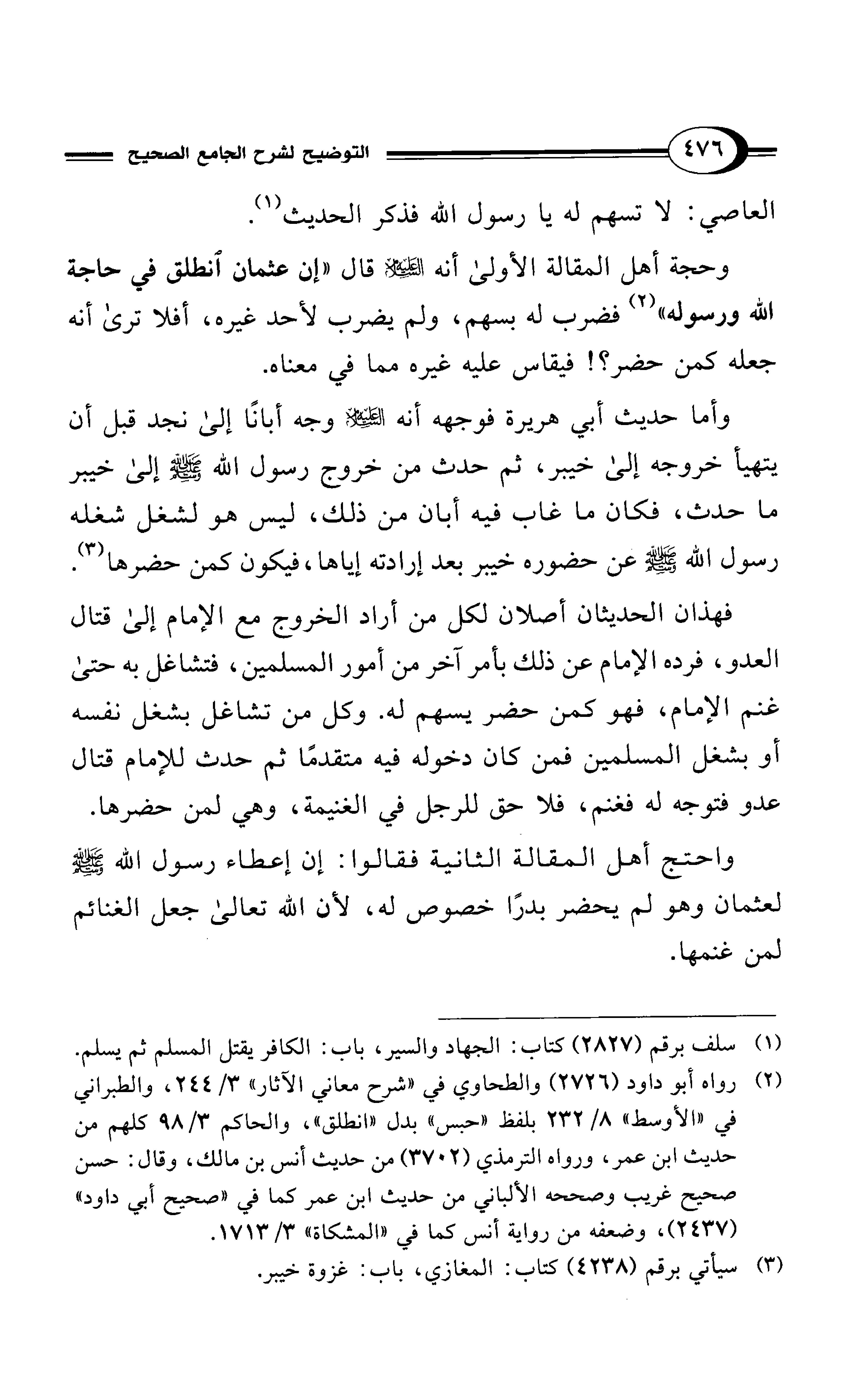 فهذان الحديثان أصلان لكل من أراد الخروج مع الإمام إلى قتال العدو، فرده الإمام عن ذلك بأمر آخر من أمور المسلمين، فتشاغل به حتى غنم الإمام، فهو كمن حضر يسهم له. وكل من تشاغل بشغل نفسه أو بشغل المسلمين فمن كان دخوله فيه متقدمًا ثم حدث للإمام قتال عدو فتوجه له فغنم، فلا حق للرجل في الغنيمة، وهي لمن حضرها.