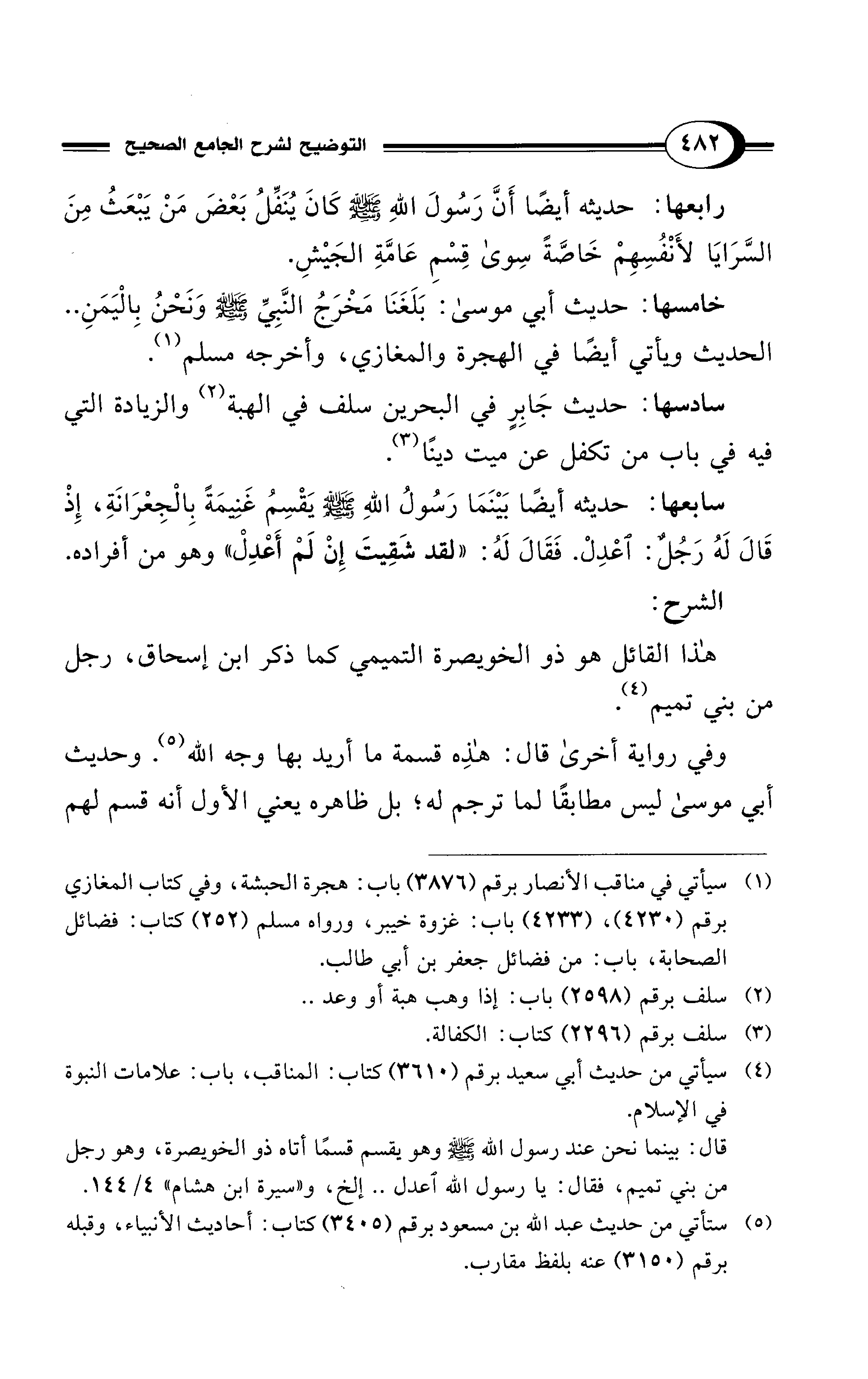 سابعها: حديثه أيضًا بَيْنَمَا رَسُولُ اللهِ - صلى الله عليه وسلم - يَقْسِمُ غَنِيمَةً بِالْجِعْرَانَةِ، إِذْ قَالَ لَهُ رَجُلٌ: اعْدِلْ. فَقَالَ لَهُ: "لقد شَقِيتَ إِنْ لَمْ أَعْدِلْ" وهو من أفراده.