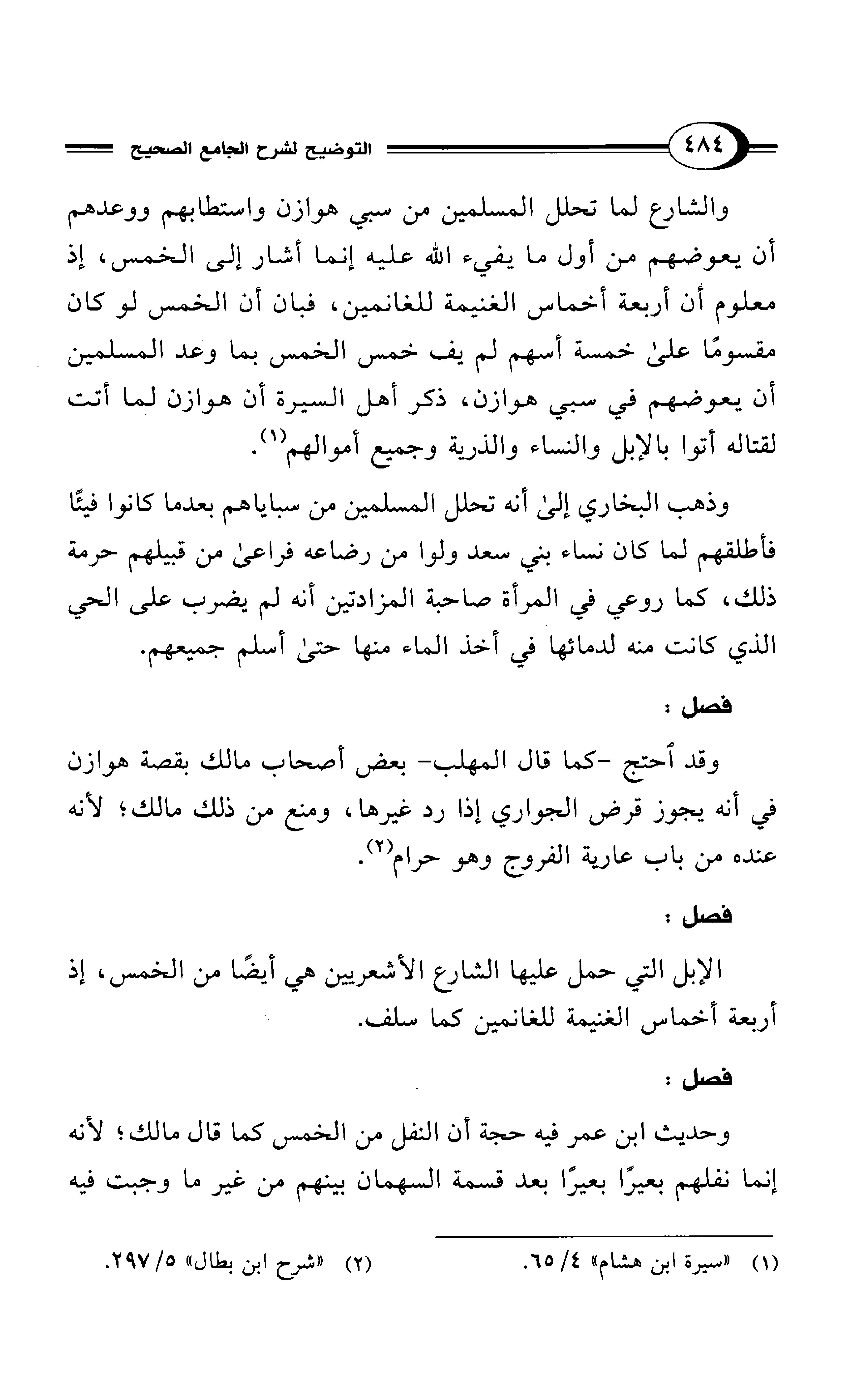 والشارع لما تحلل المسلمين من سبي هوازن واستطابهم ووعدهم أن يعوضهم من أول ما يفيء الله عليه إنما أشار إلى الخمس، إذ معلوم أن أربعة أخماس الغنيمة للغانمين، فبان أن الخمس لو كان مقسومًا على خمسة أسهم لم يف خمس الخمس بما وعد المسلمين أن يعوضهم في سبي هوازن، ذكر أهل السيرة أن هوازن لما أتت لقتاله أتوا بالإبل والنساء والذرية وجميع أموالهم (¬1).