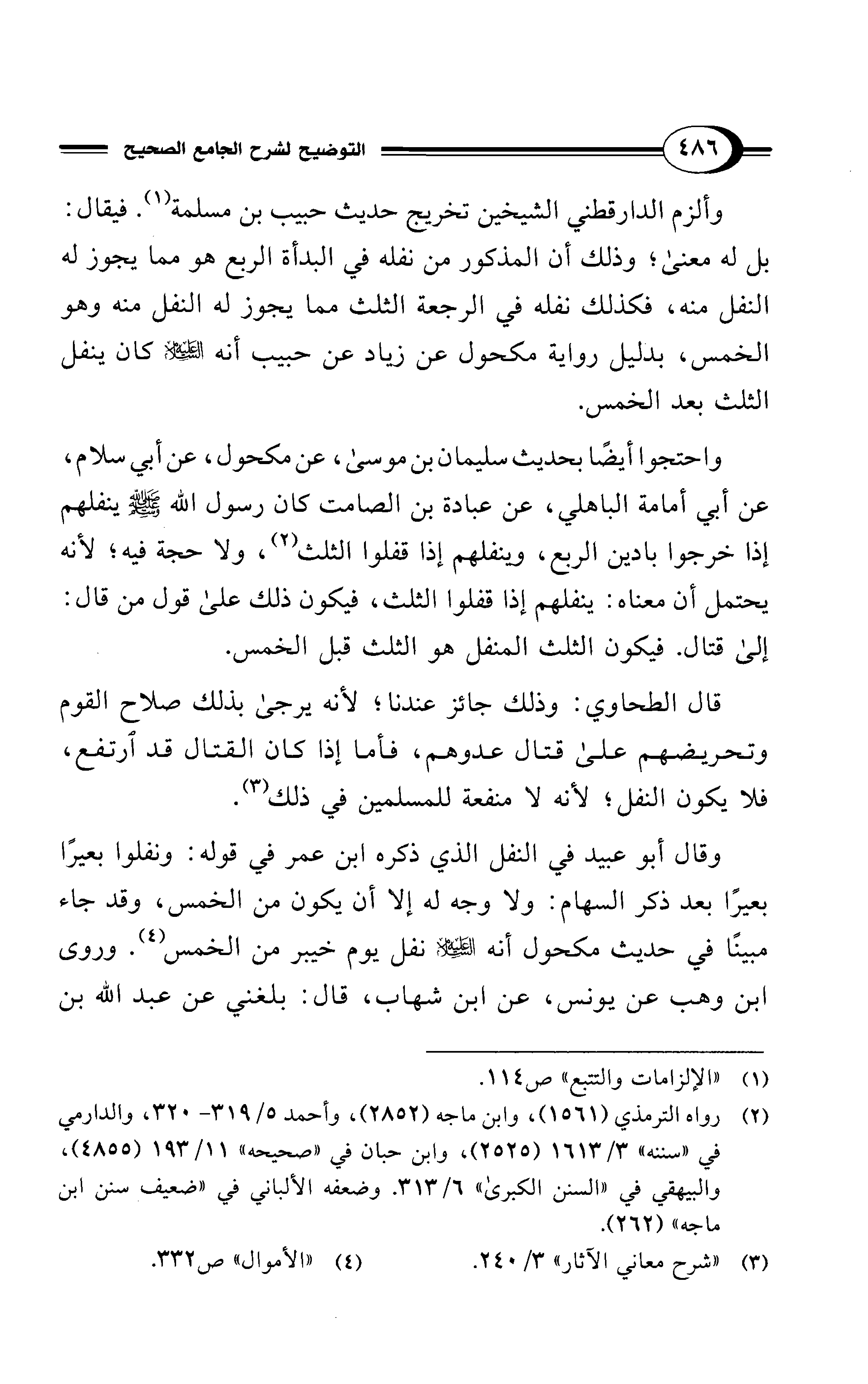 وألزم الدارقطني الشيخين تخريج حديث حبيب بن مسلمة (¬1). فيقال: بل له معنى؛ وذلك أن المذكور من نفله في البدأة الربع هو مما يجوز له النفل منه، فكذلك نفله في الرجعة الثلث مما يجوز له النفل منه وهو الخمس، بدليل رواية مكحول عن زياد عن حبيب أنه - عليه السلام - كان ينفل الثلث بعد الخمس.