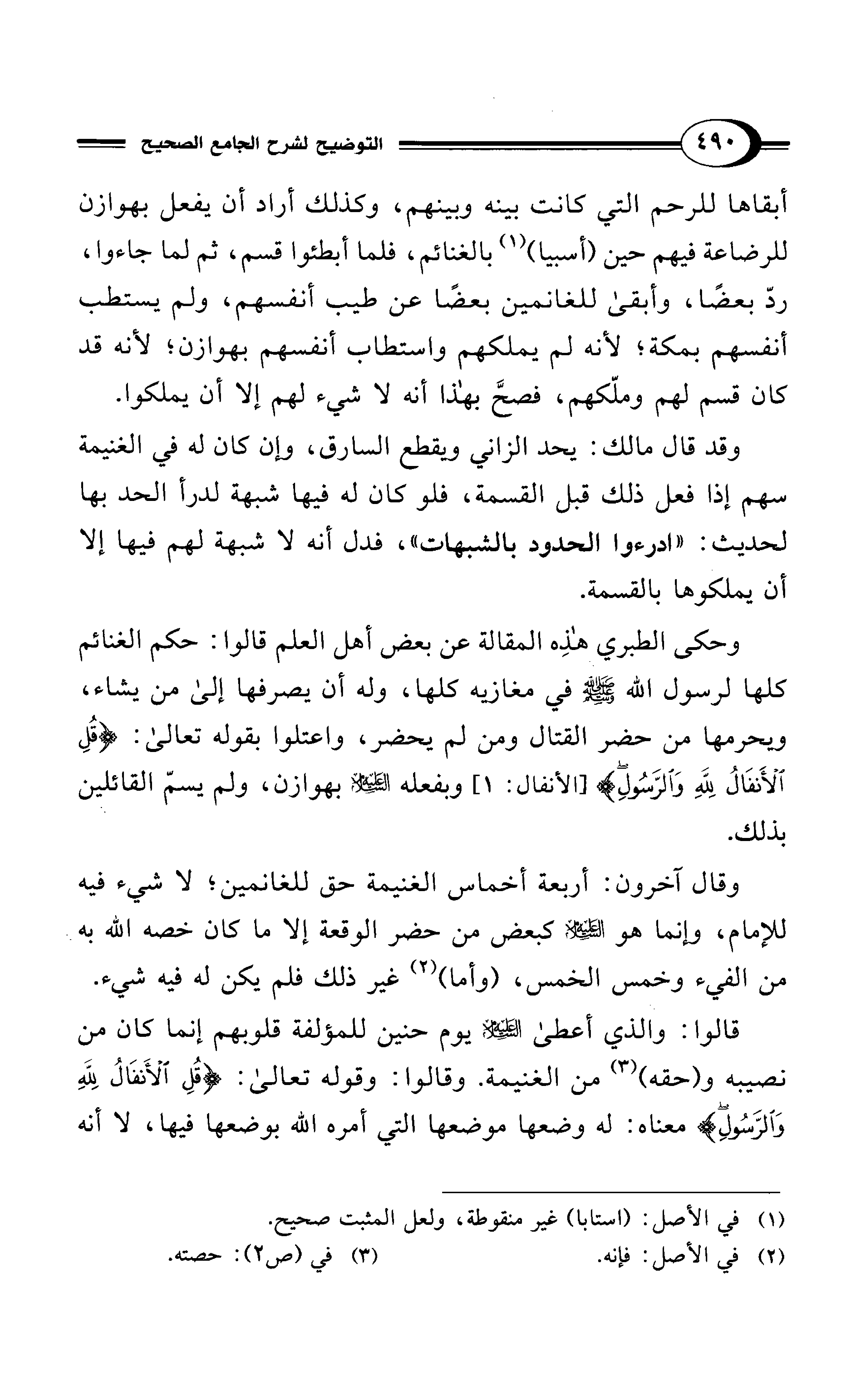 وقد قال مالك: يحد الزاني ويقطع السارق، وإن كان له في الغنيمة سهم إذا فعل ذلك قبل القسمة، فلو كان له فيها شبهة لدرأ الحد بها لحديث: "ادرءوا الحدود بالشبهات"، فدل أنه لا شبهة لهم فيها إلا أن يملكوها بالقسمة.