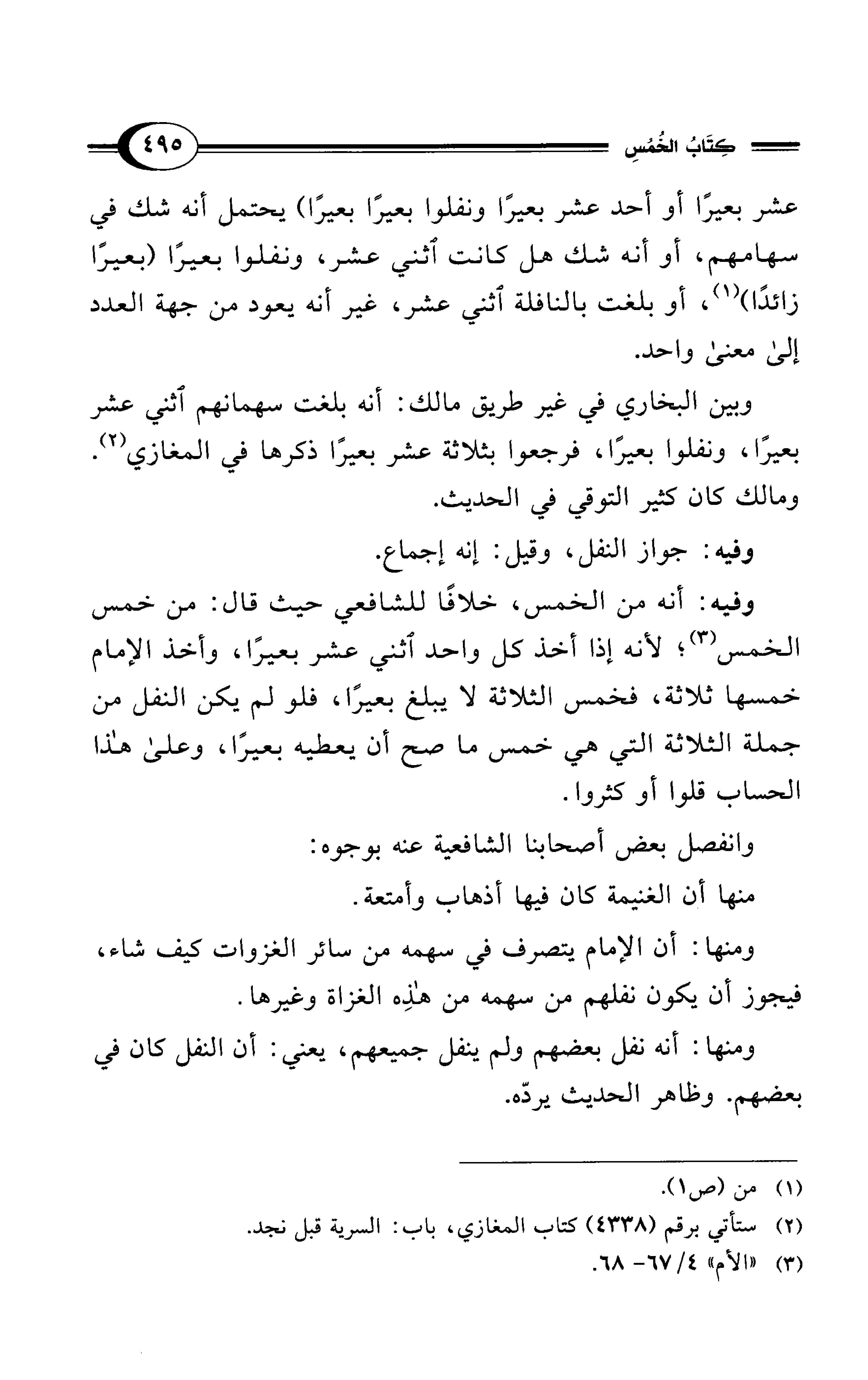 وفيه: أنه من الخمس، خلافًا للشافعي حيث قال: من خمس الخمس (¬3)؛ لأنه إذا أخذ كل واحد اثني عشر بعيرًا، وأخذ الإمام خمسها ثلاثة، فخمس الثلاثة لا يبلغ بعيرًا، فلو لم يكن النفل من جملة الثلاثة التي هي خمس ما صح أن يعطيه بعيرًا، وعلى هذا الحساب قلوا أو كثروا.
