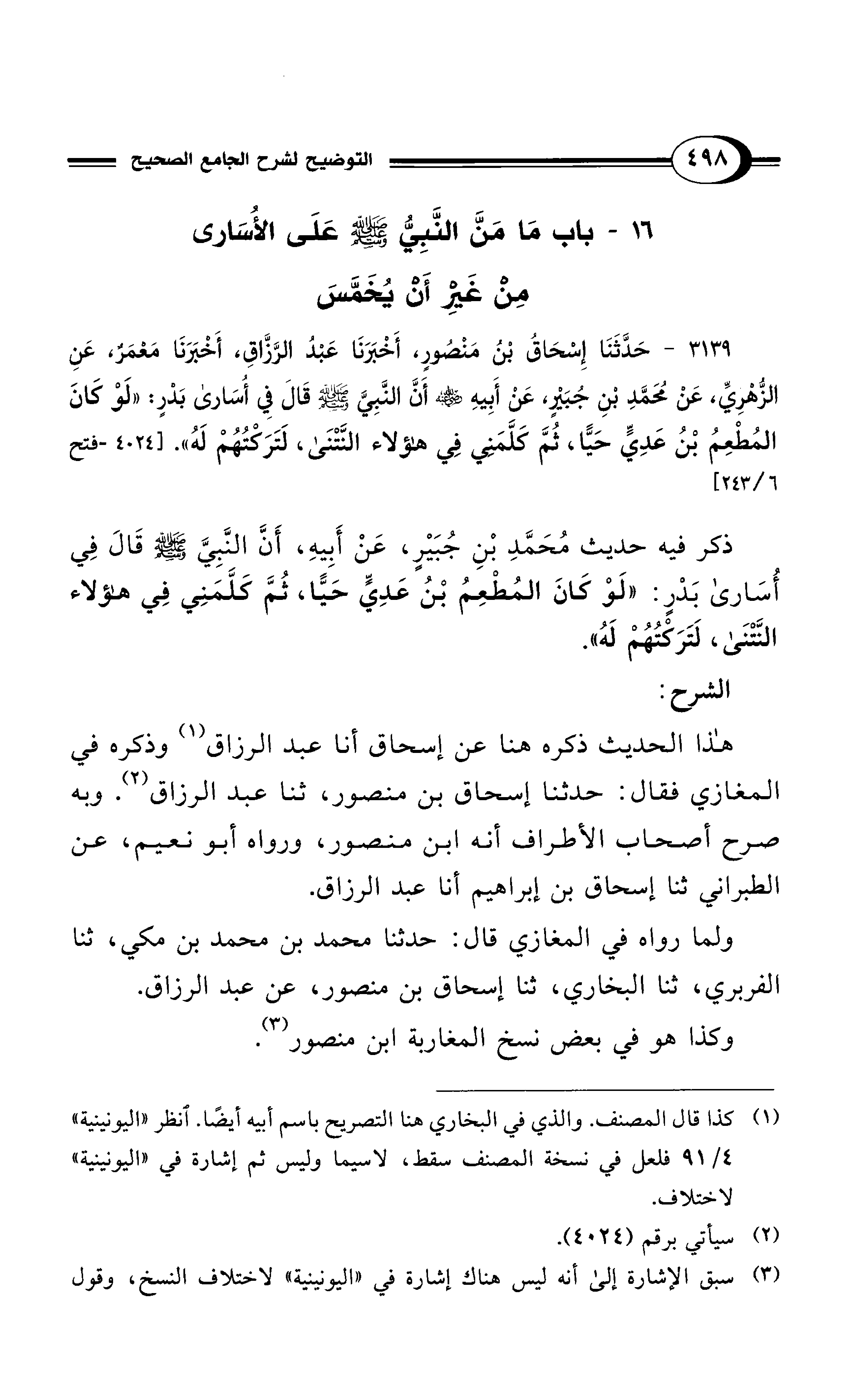 3139 - حَدَّثَنَا إِسْحَاقُ بْنُ مَنْصُورٍ، أَخْبَرَنَا عَبْدُ الرَّزَّاقِ، أَخْبَرَنَا مَعْمَرٌ، عَنِ الزُّهْرِيِّ، عَنْ مُحَمَّدِ بْنِ جُبَيْرٍ، عَنْ أَبِيهِ - رضي الله عنه - أَنَّ النَّبِيَّ - صلى الله عليه وسلم - قَالَ فِي أُسَارَى بَدْرٍ: «لَوْ كَانَ المُطْعِمُ بْنُ عَدِيٍّ حَيًّا، ثُمَّ كَلَّمَنِي فِي هَؤُلاَءِ النَّتْنَى، لَتَرَكْتُهُمْ لَهُ». [4024 - فتح 6/ 243]