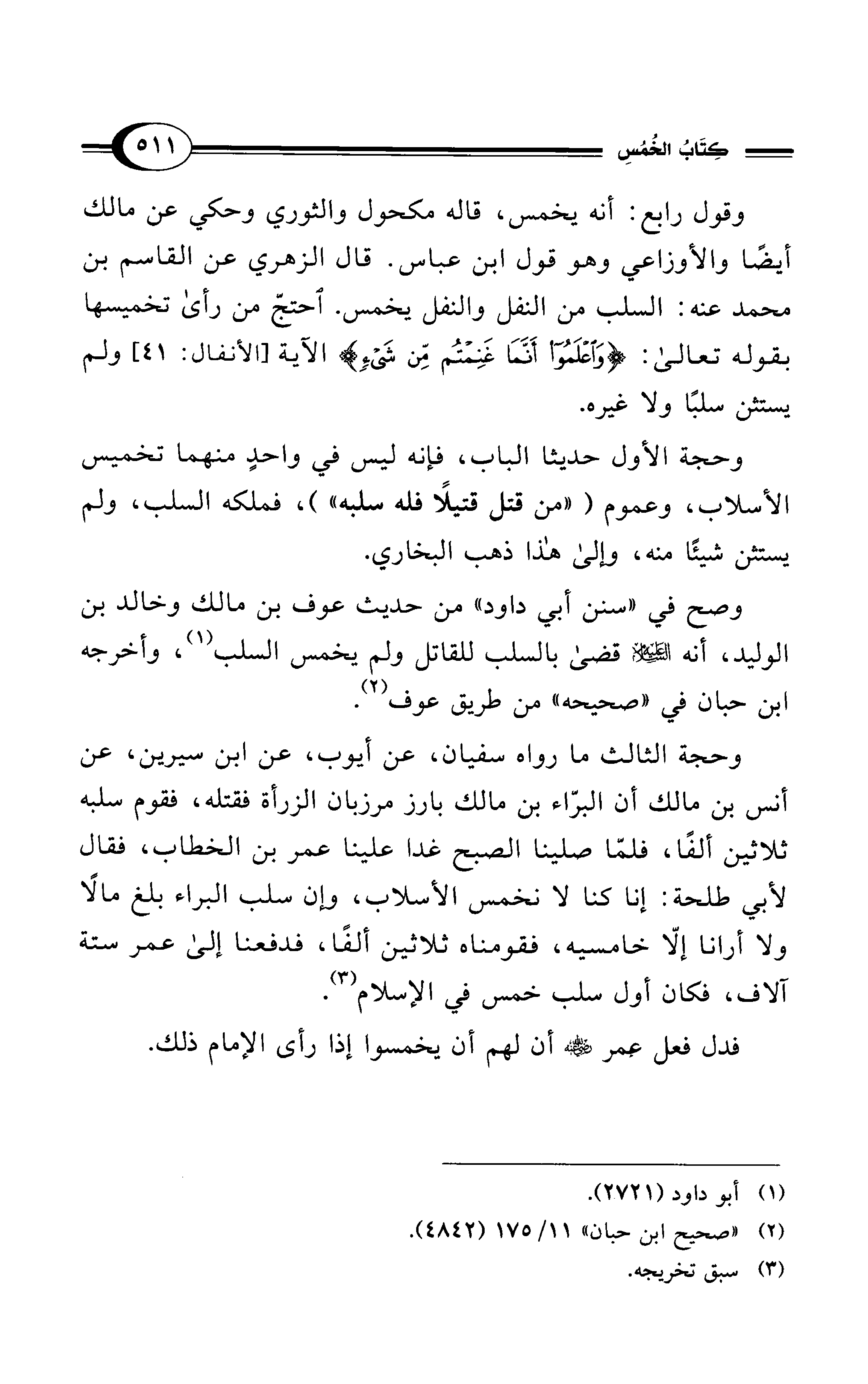 وحجة الثالث ما رواه سفيان، عن أيوب، عن ابن سيرين، عن أنس بن مالك أن البرّاء بن مالك بارز مرزبان الزرأة فقتله، فقدم سلبه ثلاثين ألفًا، فلمّا صلينا الصبح غدا علينا عمر بن الخطاب، فقال لأبي طلحة: إنا كنا لا نخمس الأسلاب، وإن سلب البراء بلغ مالاً ولا أرانا إلاَّ خامسيه، فقدمناه ثلاثين ألفًا، فدفعنا إلى عمر ستة آلاف، فكان أول سلب خمس في الإسلام (¬3).