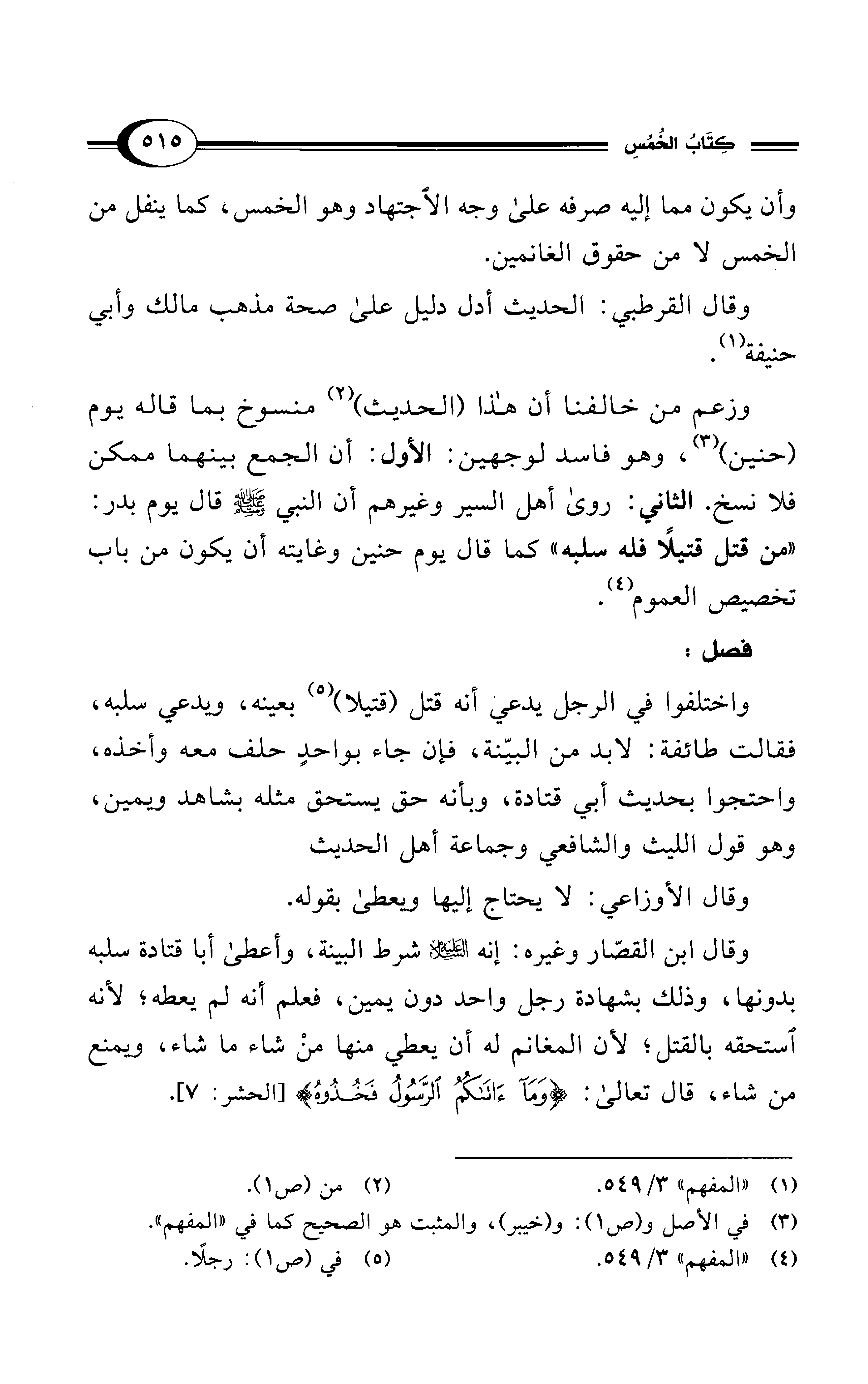 وزعم من خالفنا أن هذا (الحديث) (¬2) منسوخ مما قاله يوم (حنين) (¬3)، وهو فاسد لوجهين: الأول: أن الجمع بينهما ممكن فلا نسخ. الثاني: روى أهل السير وغيرهم أن النبي - صلى الله عليه وسلم - قال يوم بدر: "من قتل قتيلًا فله سلبه" كما قال يوم حنين وغايته أن يكون من باب تخصيص العموم (¬4).