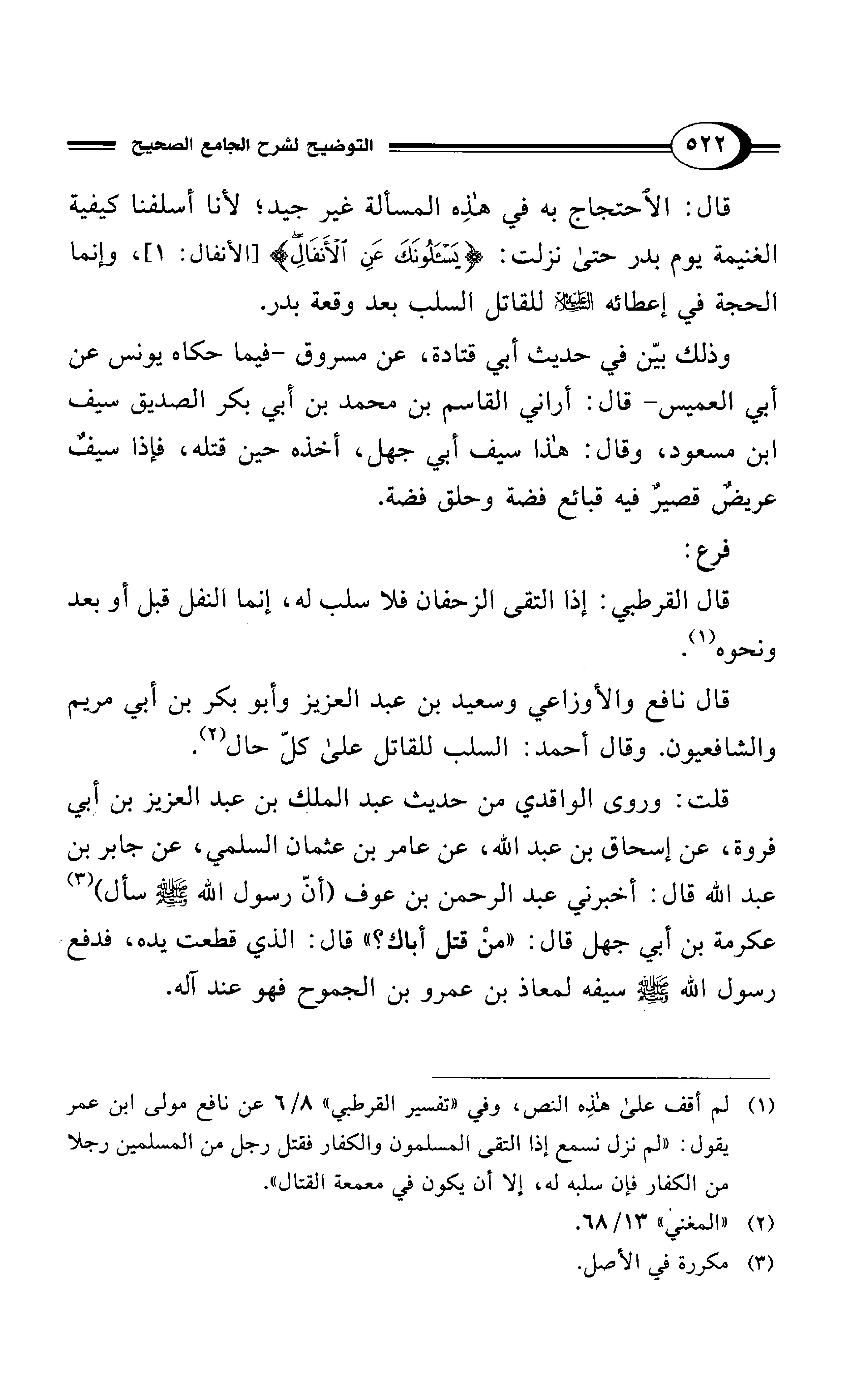 (¬1) لم أقف على هذِه النص، وفي "تفسير القرطبي" 8/ 6 عن نافع مولى ابن عمر يقول: "لم نزل نسمع إذا التقى المسلمون والكفار فقتل رجل من المسلمين رجلا من الكفار فإن سلبه له، إلا أن يكون في معمعة القتال".