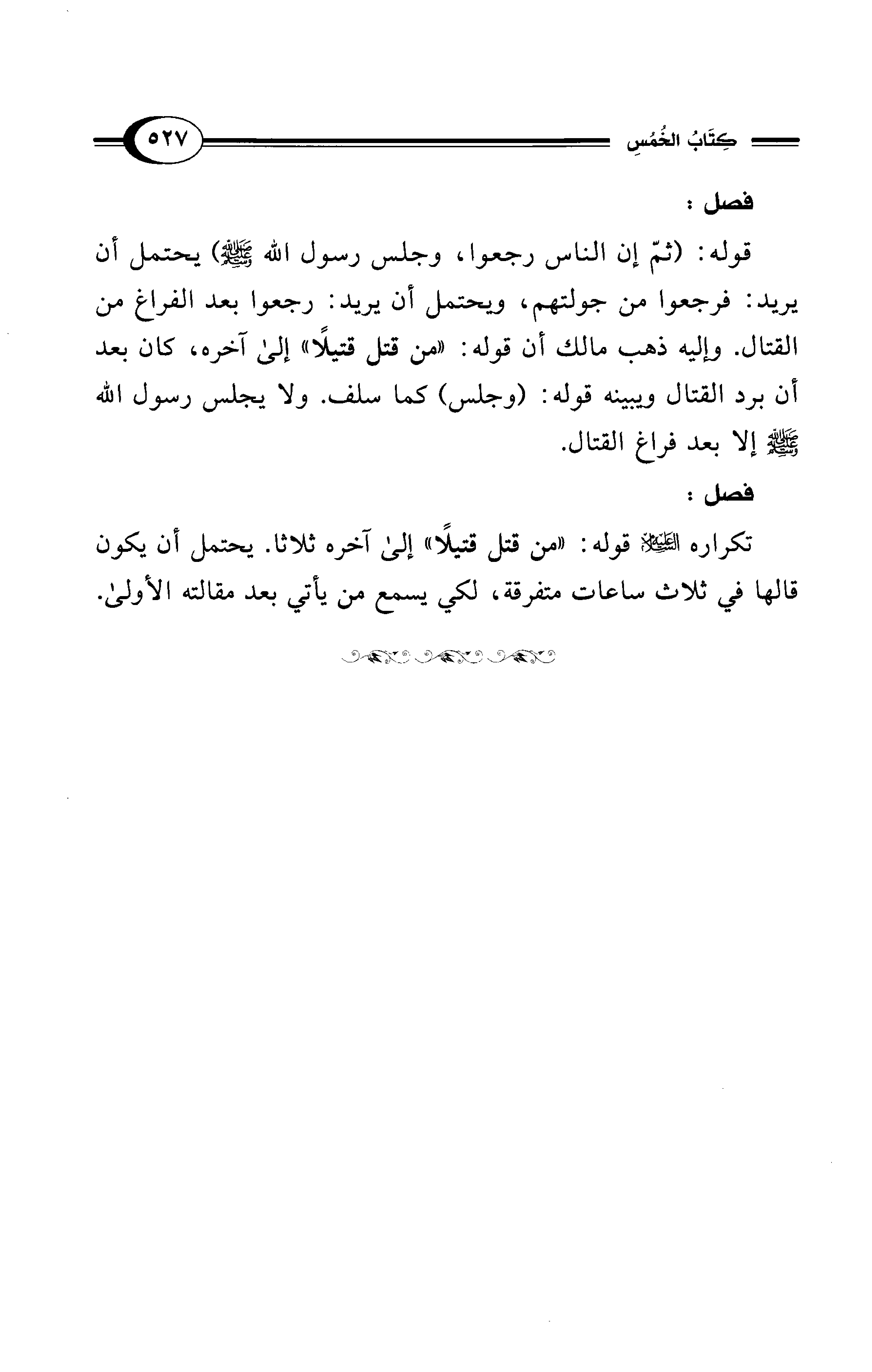 قوله: (ثمّ إن الناس رجعوا، وجلس رسول الله - صلى الله عليه وسلم -) يحتمل أن يريد: فرجعوا من جولتهم، ويحتمل أن يريد: رجعوا بعد الفراغ من القتال. وإليه ذهب مالك أن قوله: "من قتل قتيلًا" إلى آخره، كان بعد أن برد القتال ويبينه قوله: (وجلس) كما سلف. ولا يجلس رسول الله - صلى الله عليه وسلم - إلا بعد فراغ القتال.