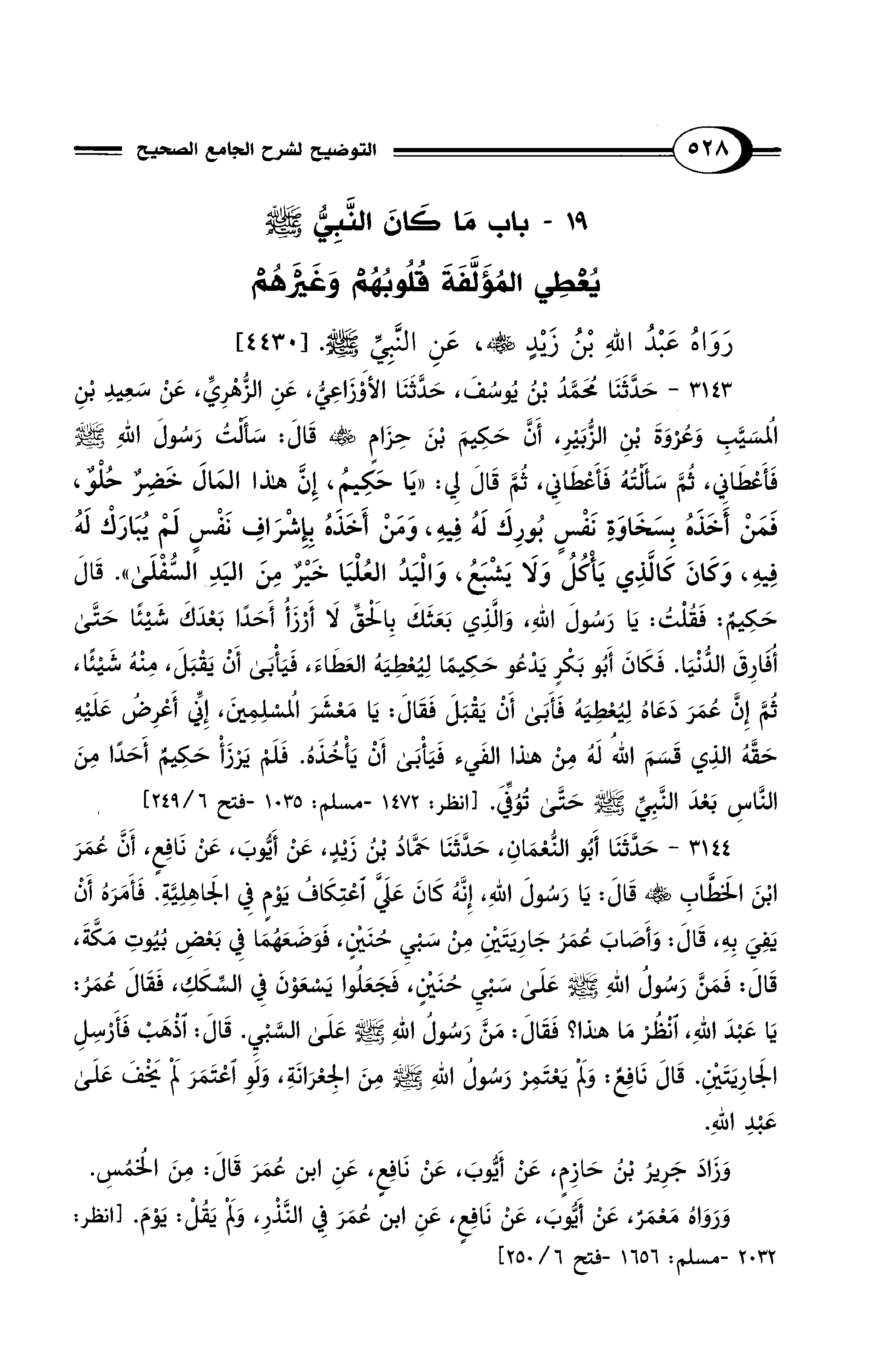3143 - حَدَّثَنَا مُحَمَّدُ بْنُ يُوسُفَ، حَدَّثَنَا الأَوْزَاعِيُّ، عَنِ الزُّهْرِيِّ، عَنْ سَعِيدِ بْنِ المُسَيَّبِ وَعُرْوَةَ بْنِ الزُّبَيْرِ، أَنَّ حَكِيمَ بْنَ حِزَامٍ - رضي الله عنه - قَالَ: سَأَلْتُ رَسُولَ اللهِ - صلى الله عليه وسلم - فَأَعْطَانِي، ثُمَّ سَأَلْتُهُ فَأَعْطَانِي، ثُمَّ قَالَ لِي: «يَا حَكِيمُ، إِنَّ هَذَا المَالَ خَضِرٌ حُلْوٌ، فَمَنْ أَخَذَهُ بِسَخَاوَةِ نَفْسٍ بُورِكَ لَهُ فِيهِ، وَمَنْ أَخَذَهُ بِإِشْرَافِ نَفْسٍ لَمْ يُبَارَكْ لَهُ فِيهِ، وَكَانَ كَالَّذِي يَأْكُلُ وَلاَ يَشْبَعُ، وَالْيَدُ العُلْيَا خَيْرٌ مِنَ اليَدِ السُّفْلَى». قَالَ حَكِيمٌ: فَقُلْتُ: يَا رَسُولَ اللهِ، وَالَّذِي بَعَثَكَ بِالْحَقِّ لاَ أَرْزَأُ أَحَدًا بَعْدَكَ شَيْئًا حَتَّى أُفَارِقَ الدُّنْيَا. فَكَانَ أَبُو بَكْرٍ يَدْعُو حَكِيمًا لِيُعْطِيَهُ الْعَطَاءَ، فَيَأْبَى أَنْ يَقْبَلَ مِنْهُ شَيْئًا، ثُمَّ إِنَّ عُمَرَ دَعَاهُ لِيُعْطِيَهُ فَأَبَى أَنْ يَقْبَلَ فَقَالَ: يَا مَعْشَرَ المُسْلِمِينَ، إِنِّي أَعْرِضُ عَلَيْهِ حَقَّهُ الذِي قَسَمَ الله لَهُ مِنْ هَذَا الْفَىْءِ، فَيَأْبَى أَنْ يَأْخُذَهُ. فَلَمْ يَرْزَأْ حَكِيمٌ أَحَدًا مِنَ النَّاسِ بَعْدَ النَّبِيِّ - صلى الله عليه وسلم - حَتَّى تُوُفِّيَ. [انظر: 1472 - مسلم: 1035 - فتح 6/ 249]