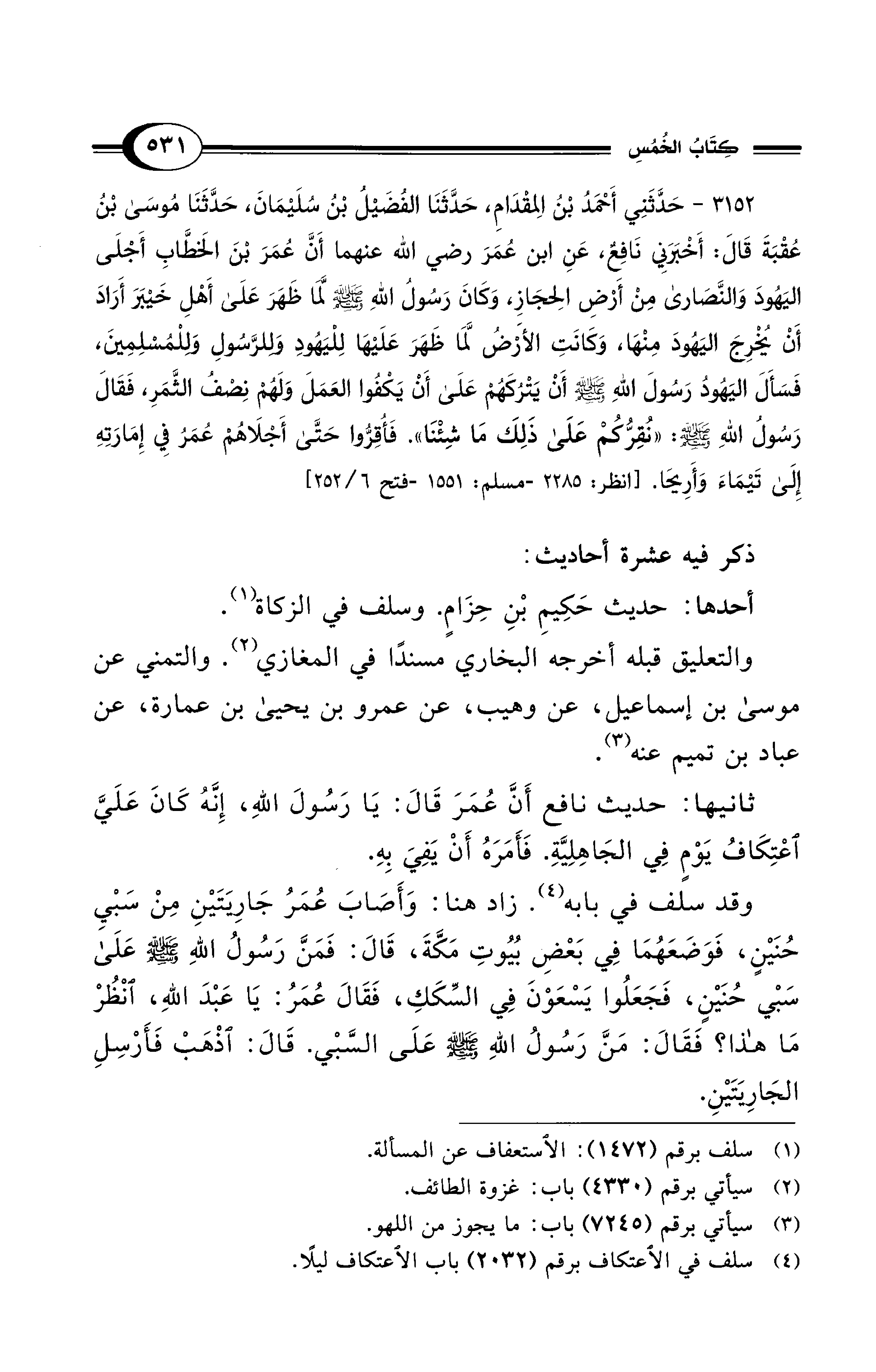 3152 - حَدَّثَنِي أَحْمَدُ بْنُ المِقْدَامِ، حَدَّثَنَا الفُضَيْلُ بْنُ سُلَيْمَانَ، حَدَّثَنَا مُوسَى بْنُ عُقْبَةَ قَالَ: أَخْبَرَنِي نَافِعٌ، عَنِ ابْنِ عُمَرَ - رضي الله عنهما - أَنَّ عُمَرَ بْنَ الخَطَّابِ أَجْلَى اليَهُودَ وَالنَّصَارَى مِنْ أَرْضِ الحِجَازِ، وَكَانَ رَسُولُ اللهِ - صلى الله عليه وسلم - لَمَّا ظَهَرَ عَلَى أَهْلِ خَيْبَرَ أَرَادَ أَنْ يُخْرِجَ اليَهُودَ مِنْهَا، وَكَانَتِ الأَرْضُ لَمَّا ظَهَرَ عَلَيْهَا لِلْيَهُودِ وَلِلرَّسُولِ وَلِلْمُسْلِمِينَ، فَسَأَلَ اليَهُودُ رَسُولَ اللهِ - صلى الله عليه وسلم - أَنْ يَتْرُكَهُمْ عَلَى أَنْ يَكْفُوا العَمَلَ، وَلَهُمْ نِصْفُ الثَّمَرِ, فَقَالَ رَسُولُ اللهِ - صلى الله عليه وسلم -: «نُقِرُّكُمْ عَلَى ذَلِكَ مَا شِئْنَا». فَأُقِرُّوا حَتَّى أَجْلاَهُمْ عُمَرُ فِي إِمَارَتِهِ إِلَى تَيْمَاءَ وَأَرِيحَا. [انظر: 2285 - مسلم: 1551 - فتح 6/ 252]