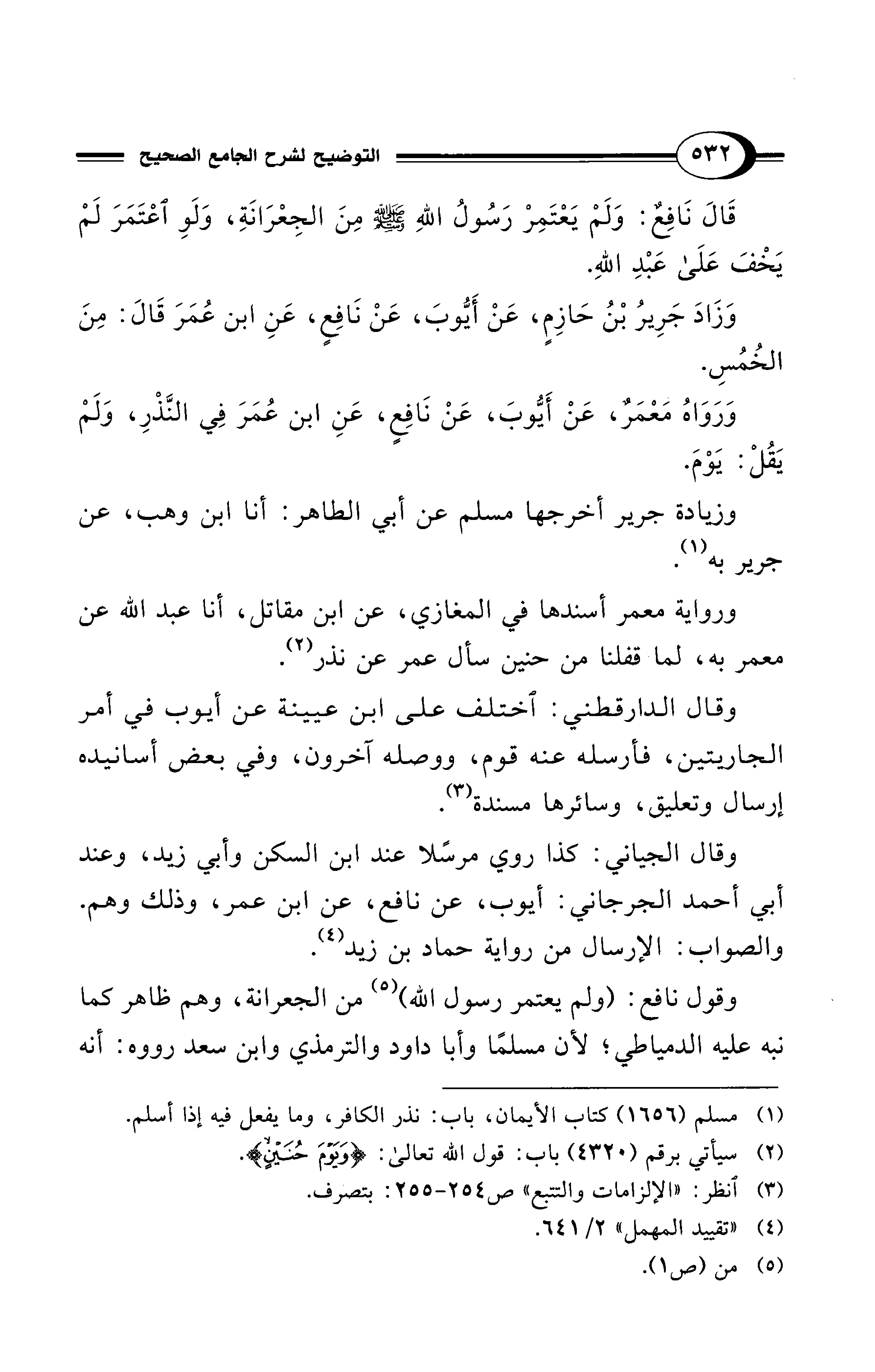 وقول نافع: (ولم يعتمر رسول الله) (¬5) من الجعرانة، وهم ظاهر كما نبه عليه الدمياطي؛ لأن مسلمًا وأبا داود والترمذي وابن سعد رووه: أنه