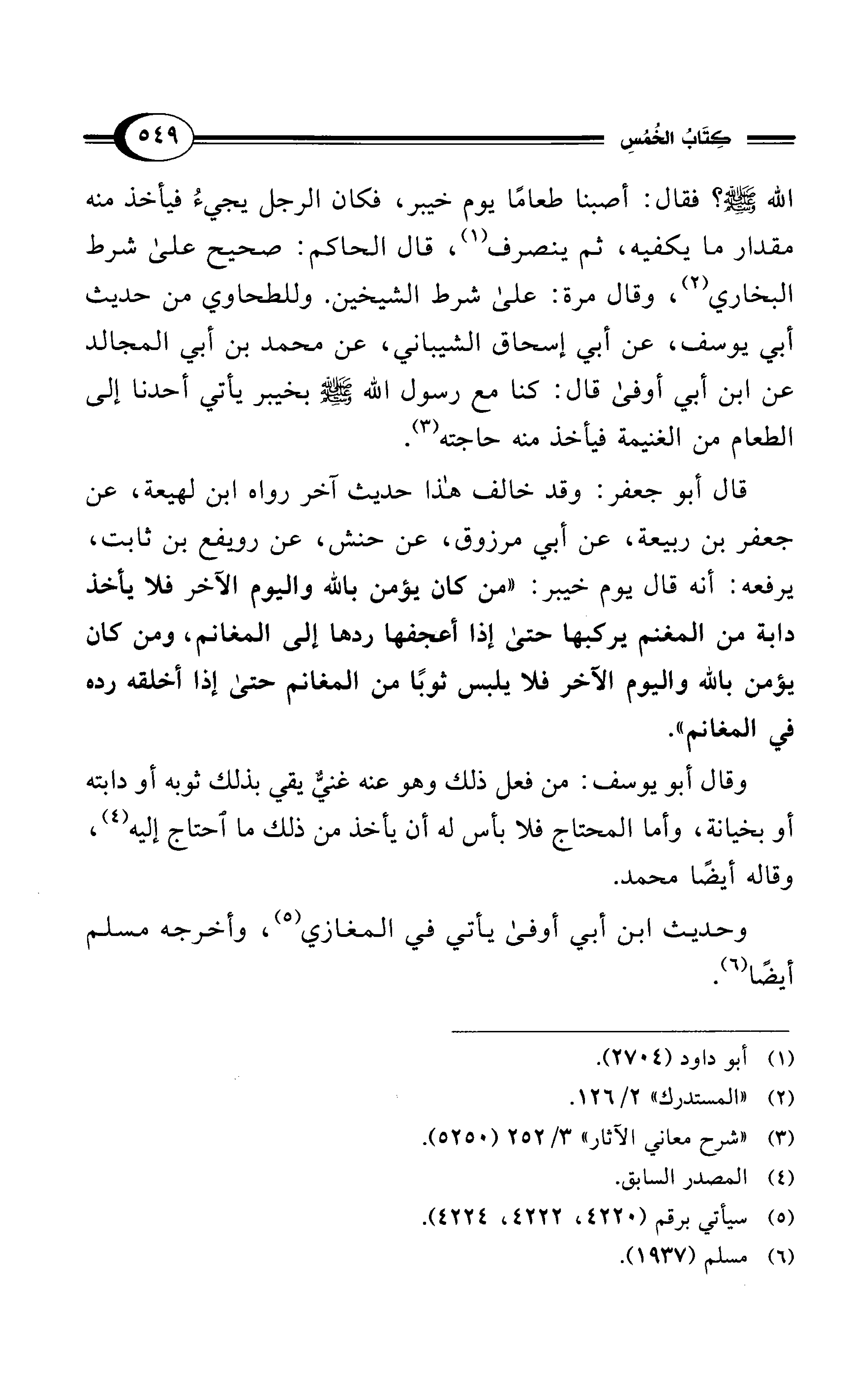 الله - صلى الله عليه وسلم -؟ فقال: أصبنا طعامًا يوم خيبر، فكان الرجل يجيءُ فيأخذ منه مقدار ما يكفيه، ثم ينصرف (¬1)، قال الحاكم: صحيح على شرط البخاري (¬2)، وقال مرة: على شرط الشيخين. وللطحاوي من حديث أبي يوسف، عن أبي إسحاق الشيباني، عن محمد بن أبي المجالد عن ابن أبي أوفى قال: كنا مع رسول - صلى الله عليه وسلم - بخيبر يأتي أحدنذا إلى الطعام من الغنيمة فيأخذ منه حاجته (¬3).