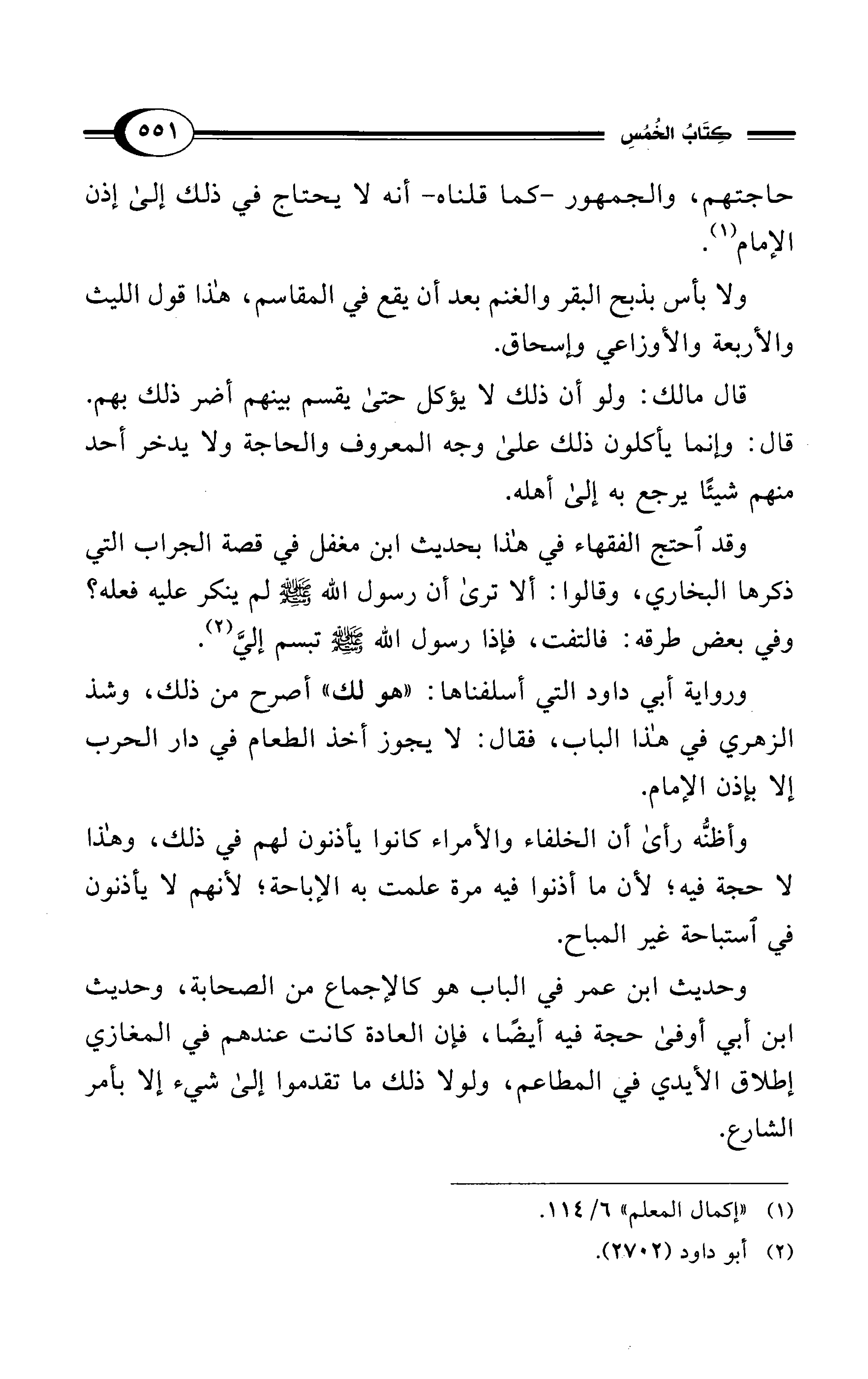 ورواية أبي داود التي أسلفناها: "هو لك" أصرح من ذلك، وشذ الزهري في هذا الباب، فقال: لا يجوز أخذ الطعام في دار الحرب إلا بإذن الإمام.
