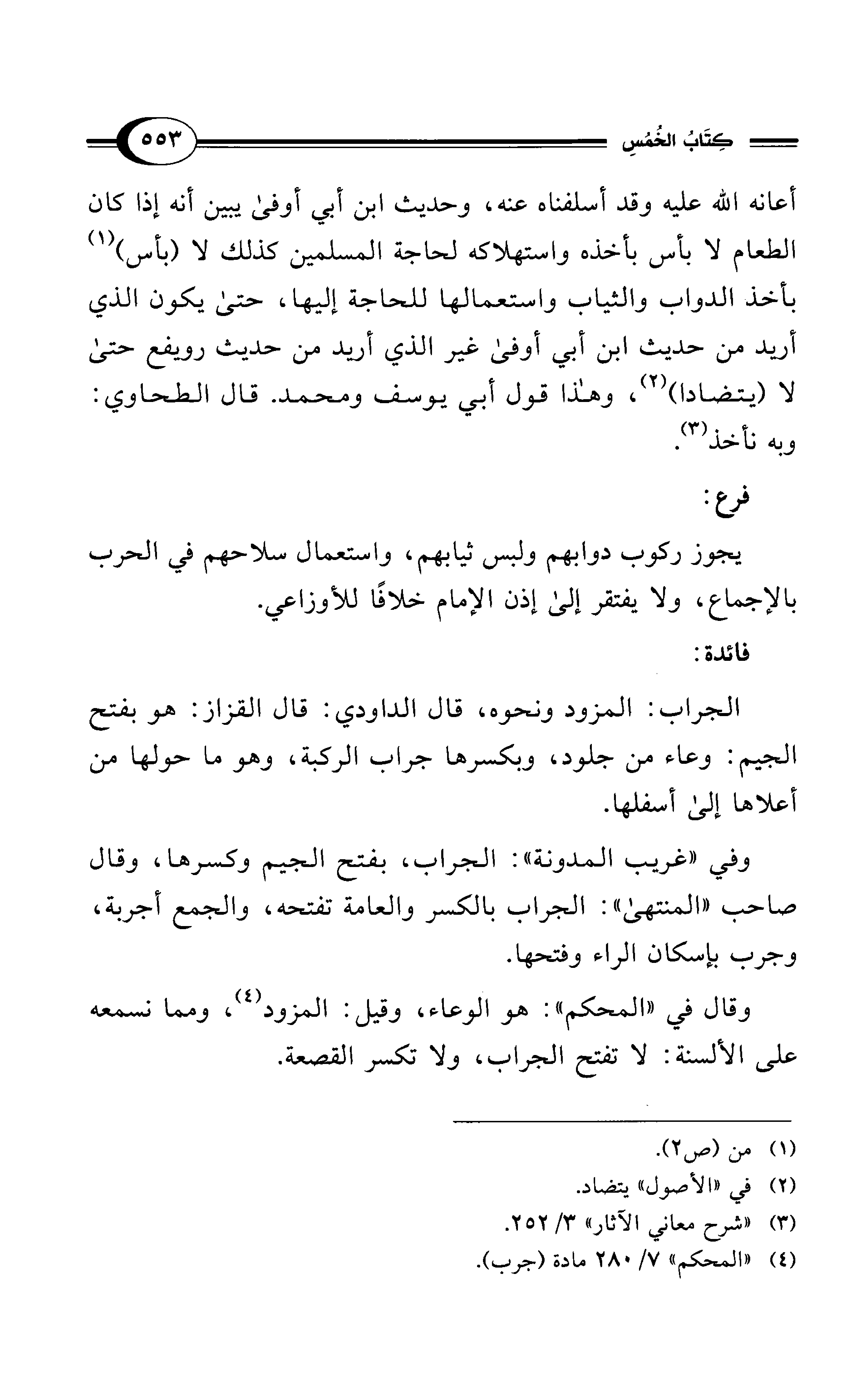 أعانه الله عليه وقد أسلفناه عنه، وحديث ابن أبي أوفى يبين أنه إذا كان الطعام لا بأس بأخذه واستهلاكه لحاجة المسلمين كذلك لا (بأس) (¬1) بأخذ الدواب والثياب واستعمالها للحاجة إليها، حتى يكون الذي أريد من حديث ابن أبي أوفى غير الذي أريد من حديث رويفع حتى لا (يتضادا) (¬2)، وهذا قول أبي يوسف ومحمد. قال الطحاوي: وبه نأخذ (¬3).
