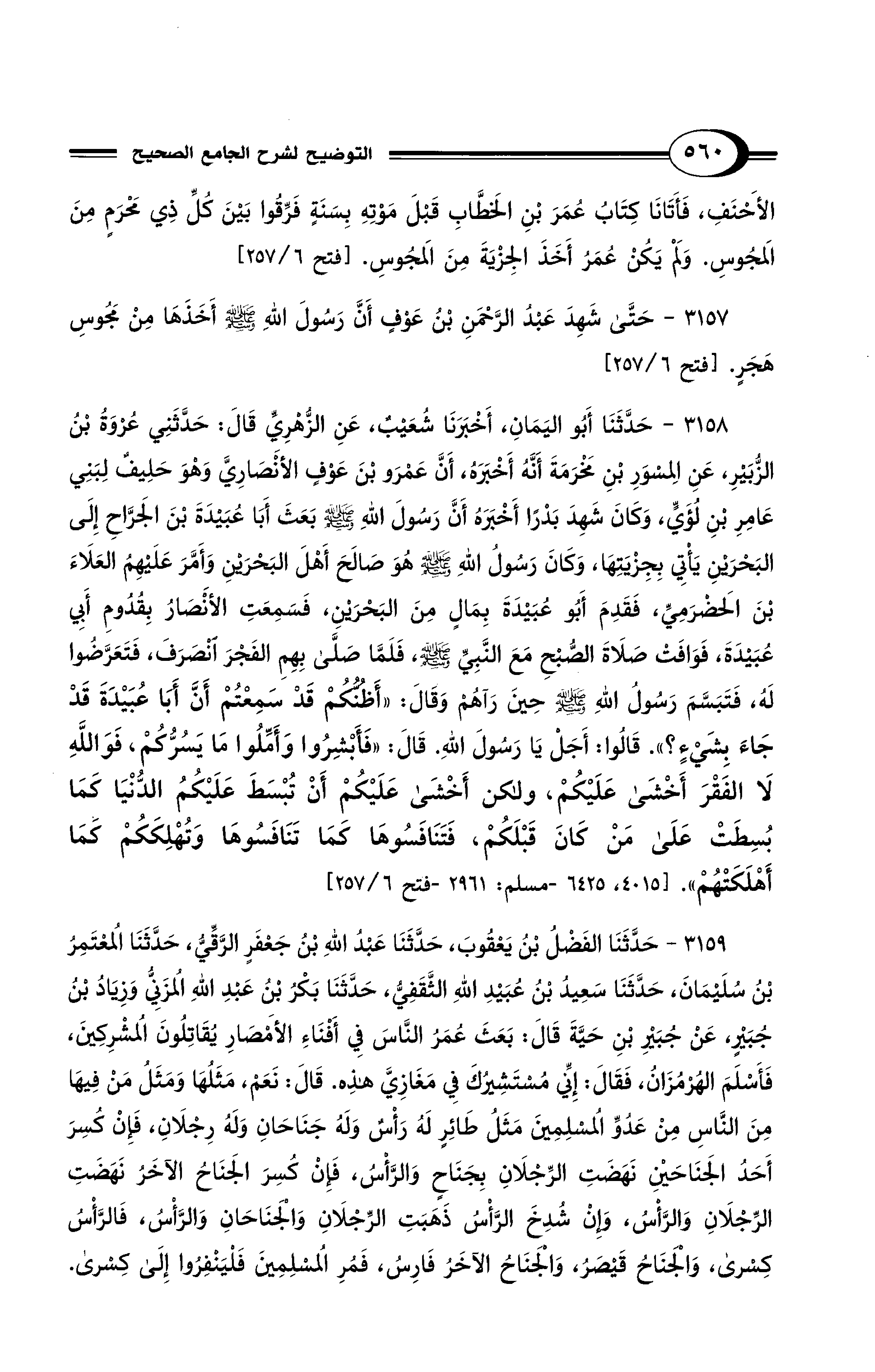 3157 - حَتَّى شَهِدَ عَبْدُ الرَّحْمَنِ بْنُ عَوْفٍ أَنَّ رَسُولَ اللهِ - صلى الله عليه وسلم - أَخَذَهَا مِنْ مَجُوسِ هَجَرٍ. [فتح 6/ 257]