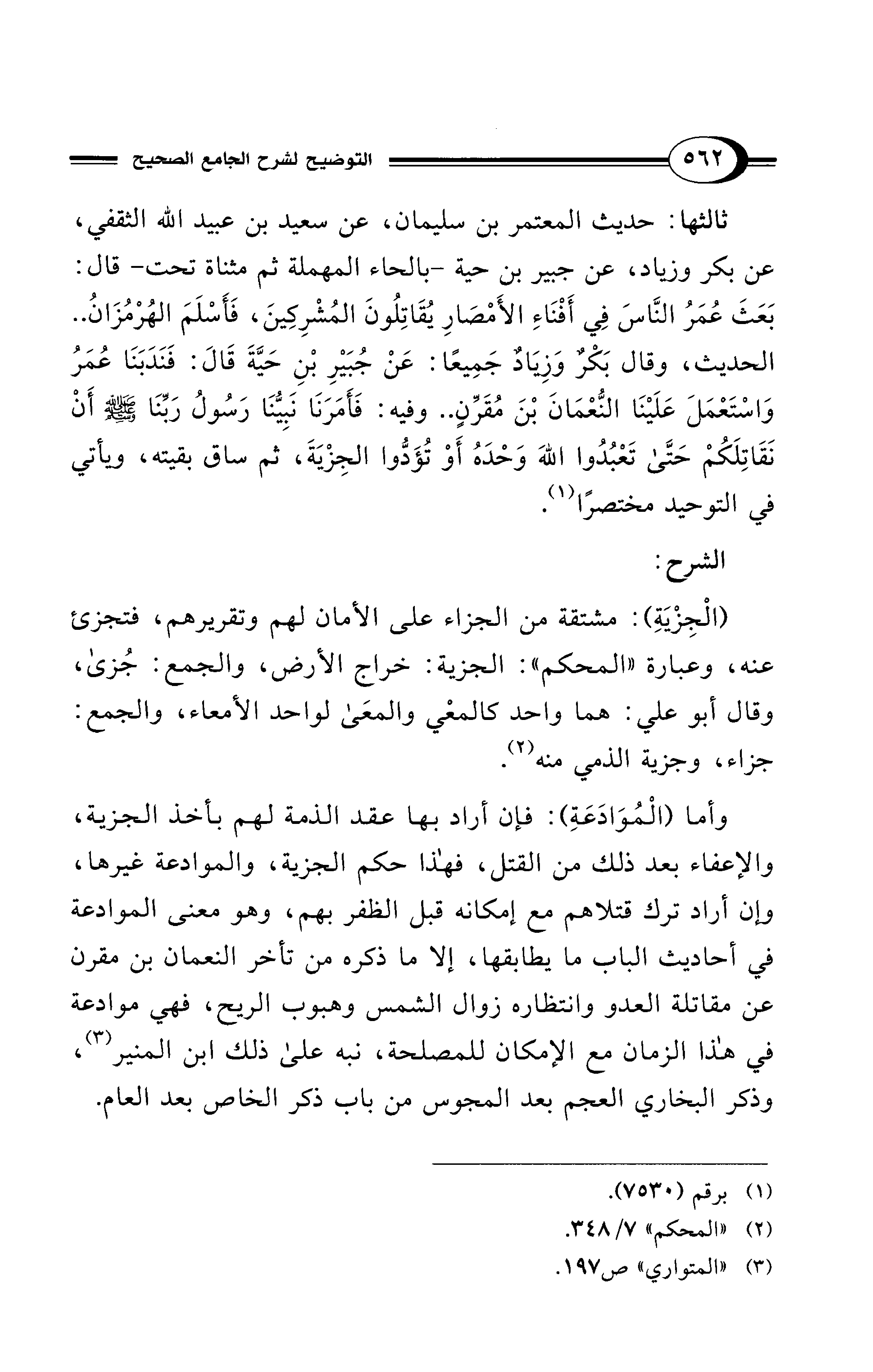 وأما (الْمُوَادَعَةِ): فإن أراد بها عقد الذمة لهم بأخذ الجزية، والإعفاء بعد ذلك من القتل، فهذا حكم الجزية، والموادعة غيرها، وإن أراد ترك قتلاهم مع إمكانه قبل الظفر بهم، وهو معنى الموادعة في أحاديث الباب ما يطابقها، إلا ما ذكره من تأخر النعمان بن مقرن عن مقاتلة العدو وانتظاره زوال الشمس وهبوب الريح، فهي موادعة في هذا الزمان مع الإمكان للمصلحة، نبه على ذلك ابن المنير (¬3)، وذكر البخاري العجم بعد المجوس من باب ذكر الخاص بعد العام.