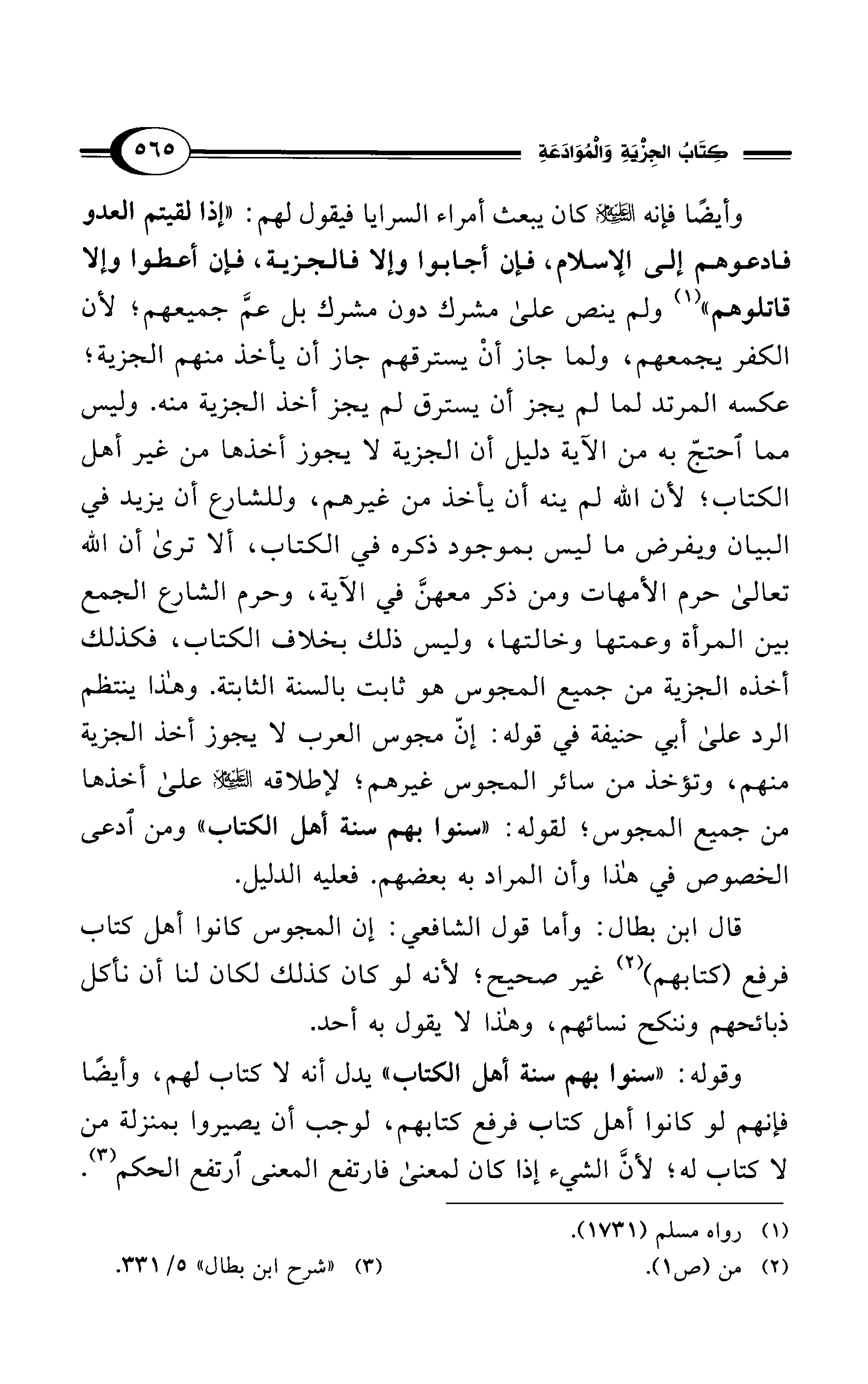 وأيضًا فإنه - عليه السلام - كان يبعث أمراء السرايا فيقول لهم: "إذا لقيتم العدو فادعوهم إلى الإسلام، فإن أجابوا وإلا فالجزية، فإن أعطوا وإلا قاتلوهم" (¬1) ولم ينص على مشرك دون مشرك بل عمَّ جميعهم؛ لأن الكفر يجمعهم، ولما جاز أنْ يسترقهم جاز أن يأخذ منهم الجزية؛ عكسه المرتد لما لم يجز أن يسترق لم يجز أخذ الجزية منه. وليس مما احتجّ به من الآية دليل أن الجزية لا يجوز أخذها من غير أهل الكتاب؛ لأن الله لم ينه أن يأخذ من غيرهم، وللشارع أن يزيد في البيان ويفرض ما ليس بموجود ذكره في الكتاب، ألا ترى أن الله تعالى حرم الأمهات ومن ذكر معهنَّ في الآية، وحرم الشارع الجمع بين المرأة وعمتها وخالتها, وليس ذلك بخلاف الكتاب، فكذلك أخذه الجزية من جميع المجوس هو ثابت بالسنة الثابتة. وهذا ينتظم الرد على أبي حنيفة في قوله: إنّ مجوس العرب لا يجوز أخذ الجزية منهم، وتؤخذ من سائر المجوس غيرهم؛ لإطلاقه - عليه السلام - على أخذها من جميع المجوس؛ لقوله: "سنوا بهم سنة أهل الكتاب" ومن ادعى الخصوص في هذا وأن المراد به بعضهم. فعليه الدليل.