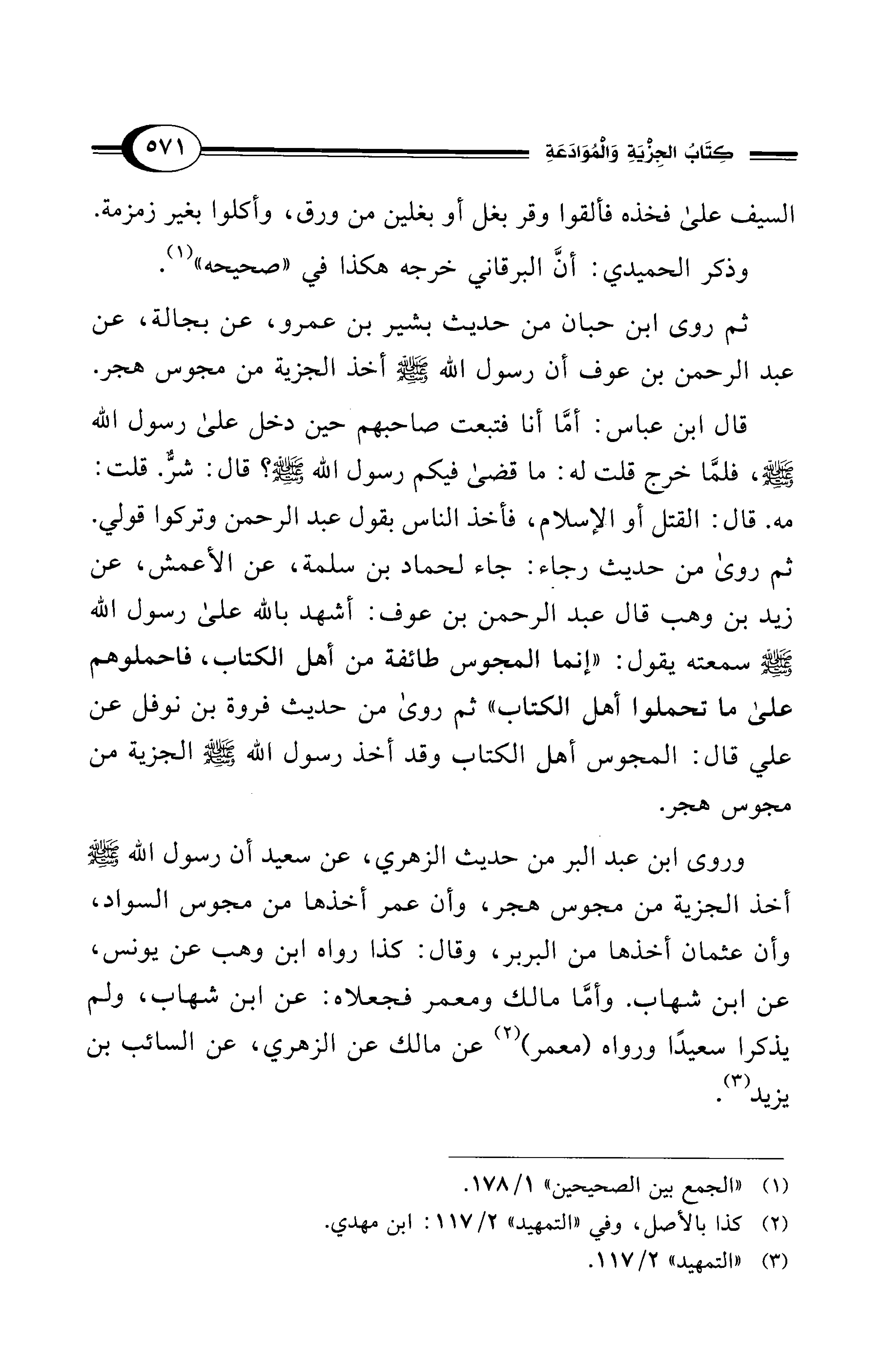 ثم روى من حديث رجاء: جاء لحماد بن سلمة، عن الأعمش، عن زيد بن وهب قال عبد الرحمن بن عوف: أشهد بالله على رسول الله - صلى الله عليه وسلم - سمعته يقول: "إنما المجوس طائفة من أهل الكتاب، فاحملوهم على ما تحملوا أهل الكتاب" ثم روى من حديث فروة بن نوفل عن على قال: المجوس أهل الكتاب وقد أخذ رسول الله - صلى الله عليه وسلم - الجزية من مجوس هجر.