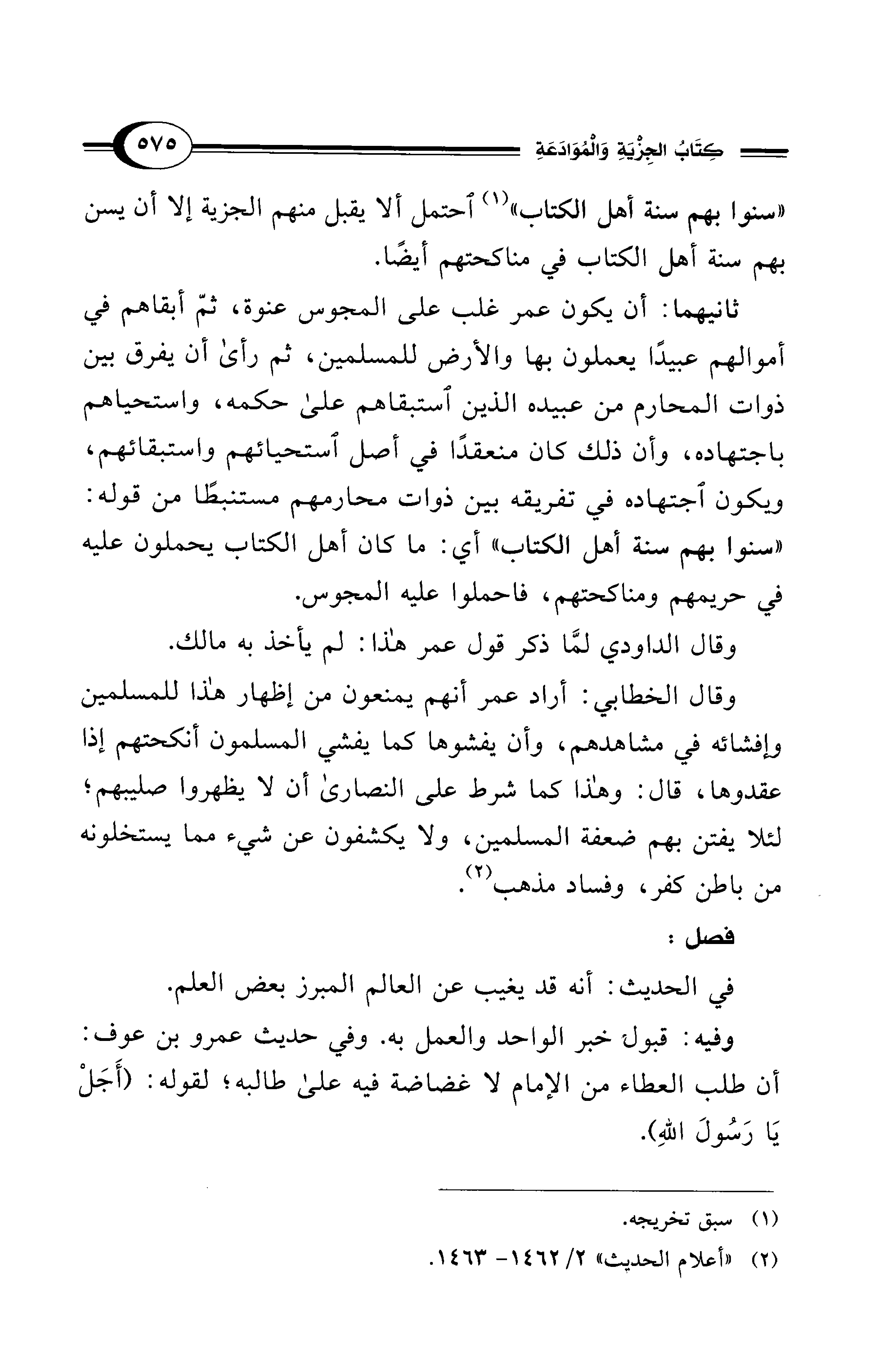 ثانيهما: أن يكون عمر غلب على المجوس عنوة، ثمّ أبقاهم في أموالهم عبيدًا يعملون بها والأرض للمسلمين، ثم رأى أن يفرق بين ذوات المحارم من عبيده الذين استبقاهم على حكمه، واستحياهم باجتهاده، وأن ذلك كان منعقدًا في أصل استحيائهم واستبقائهم، ويكون اجتهاده في تفريقه بين ذوات محارمهم مستنبطًا من قوله: "سنوا بهم سنة أهل الكتاب" أي: ما كان أهل الكتاب يحملون عليه في حريمهم ومناكحتهم، فاحملوا عليه المجوس.