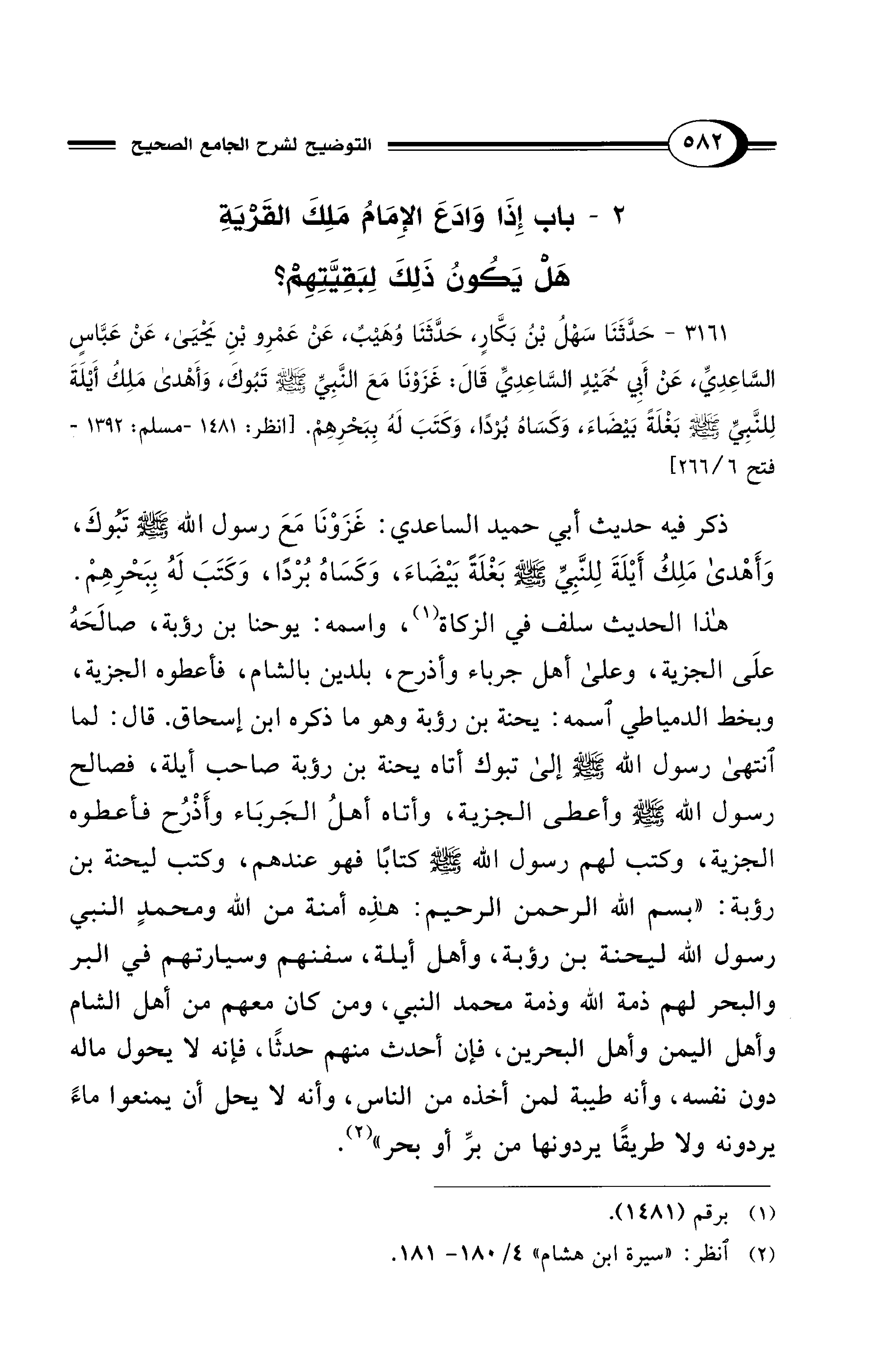 2 - باب إِذَا وَادَعَ الإِمَامُ مَلِكَ القَرْيَةِ هَل يَكُونُ ذَلِكَ لِبَقِيَّتِهِمْ؟