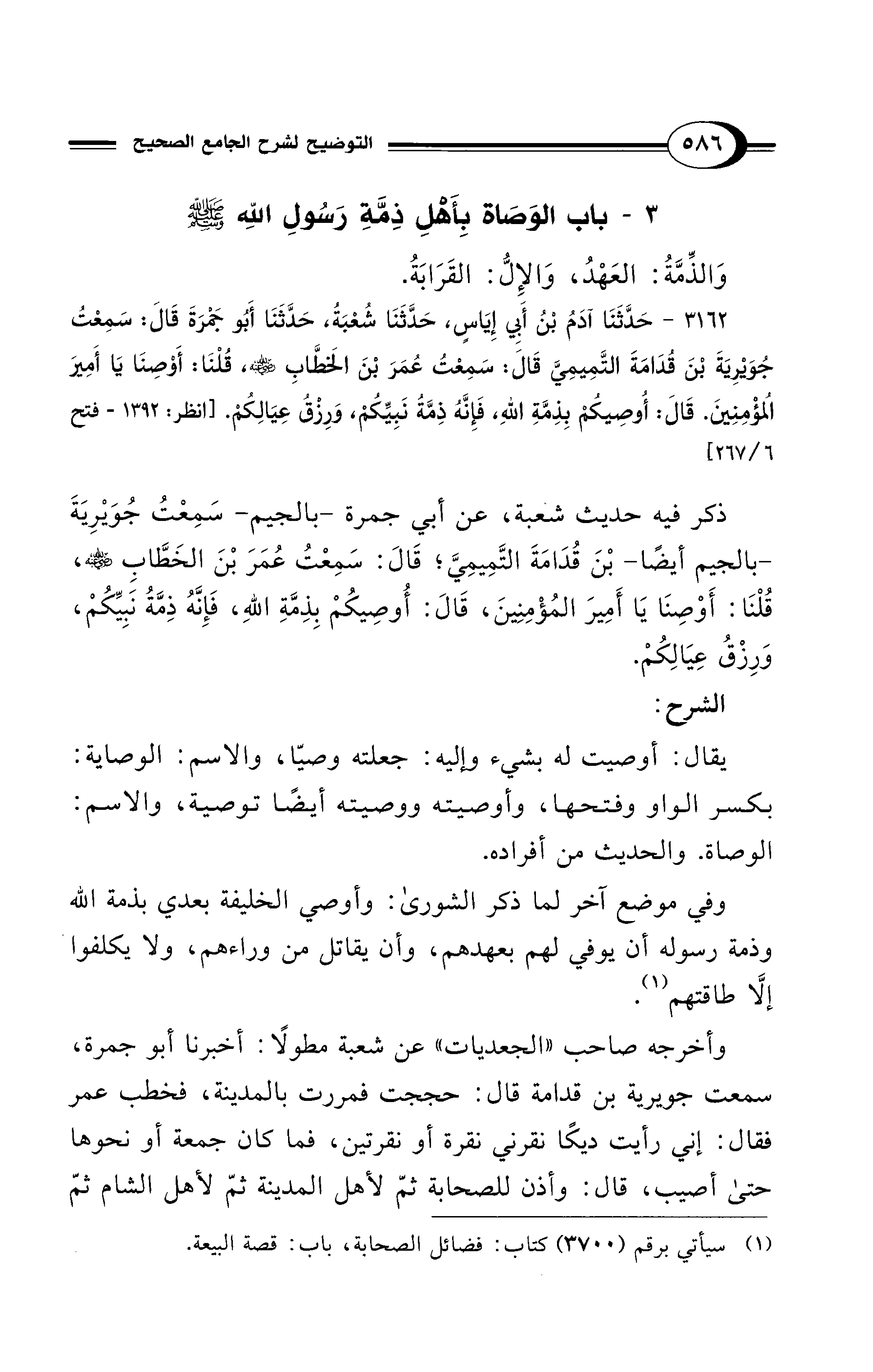 3162 - حَدَّثَنَا آدَمُ بْنُ أَبِي إِيَاسٍ, حَدَّثَنَا شُعْبَةُ, حَدَّثَنَا أَبُو جَمْرَةَ قَالَ: سَمِعْتُ جُوَيْرِيَةَ بْنَ قُدَامَةَ التَّمِيمِىَّ قَالَ: سَمِعْتُ عُمَرَ بْنَ الخَطَّابِ - رضي الله عنه -, قُلْنَا: أَوْصِنَا يَا أَمِيرَ الْمُؤْمِنِينَ. قَالَ: أُوصِيكُمْ بِذِمَّةِ اللهِ، فَإِنَّهُ ذِمَّةُ نَبِيِّكُمْ، وَرِزْقُ عِيَالِكُمْ. [انظر: 1392 - فتح 6/ 267]
