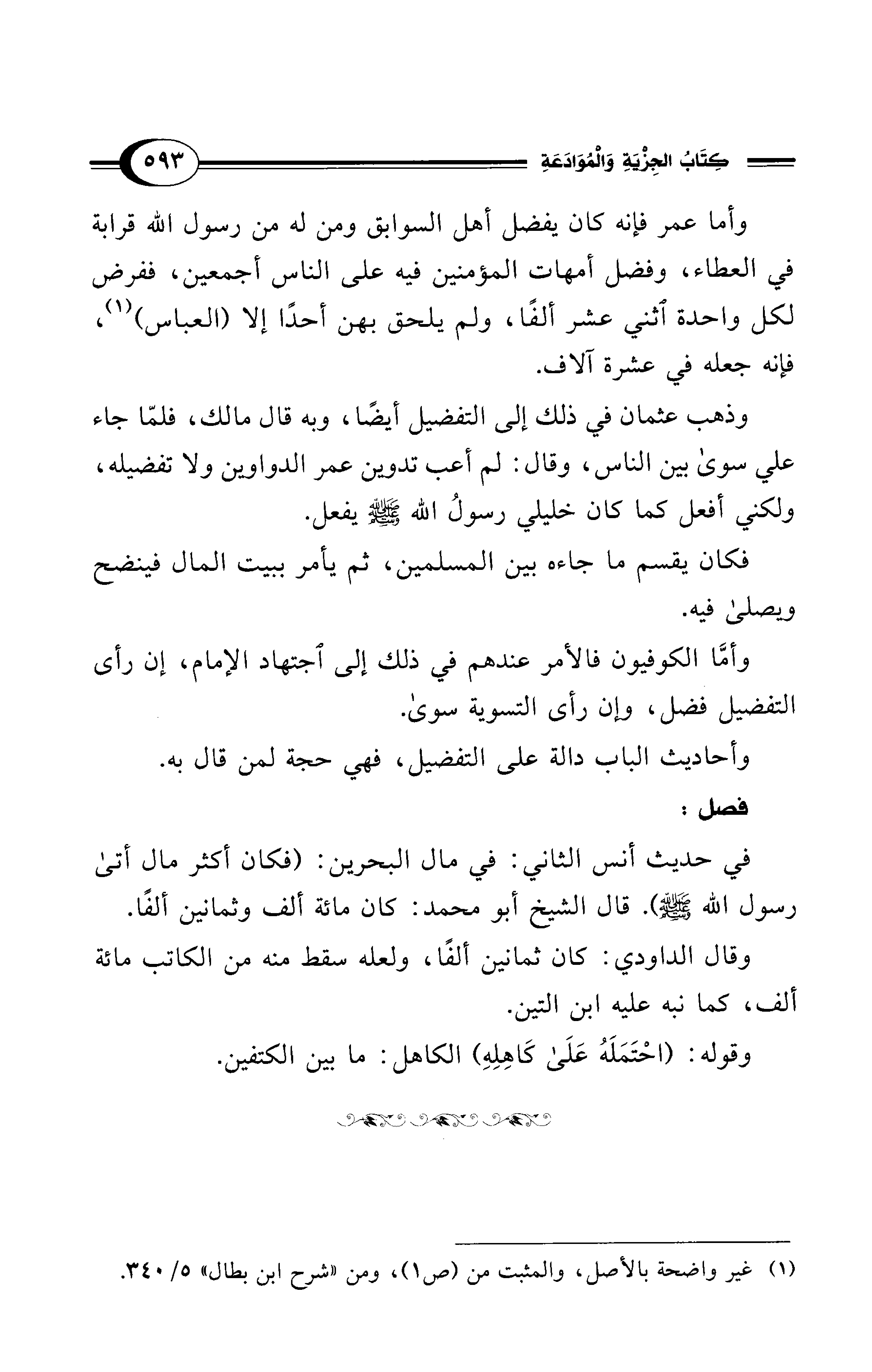 وذهب عثمان في ذلك إلى التفضيل أيضًا، وبه قال مالك، فلمّا جاء على سوى بين الناس، وقال: لم أعب تدوين عمر الدواوين ولا تفضيله، ولكني أفعل كما كان خليلي رسولُ الله - صلى الله عليه وسلم - يفعل.