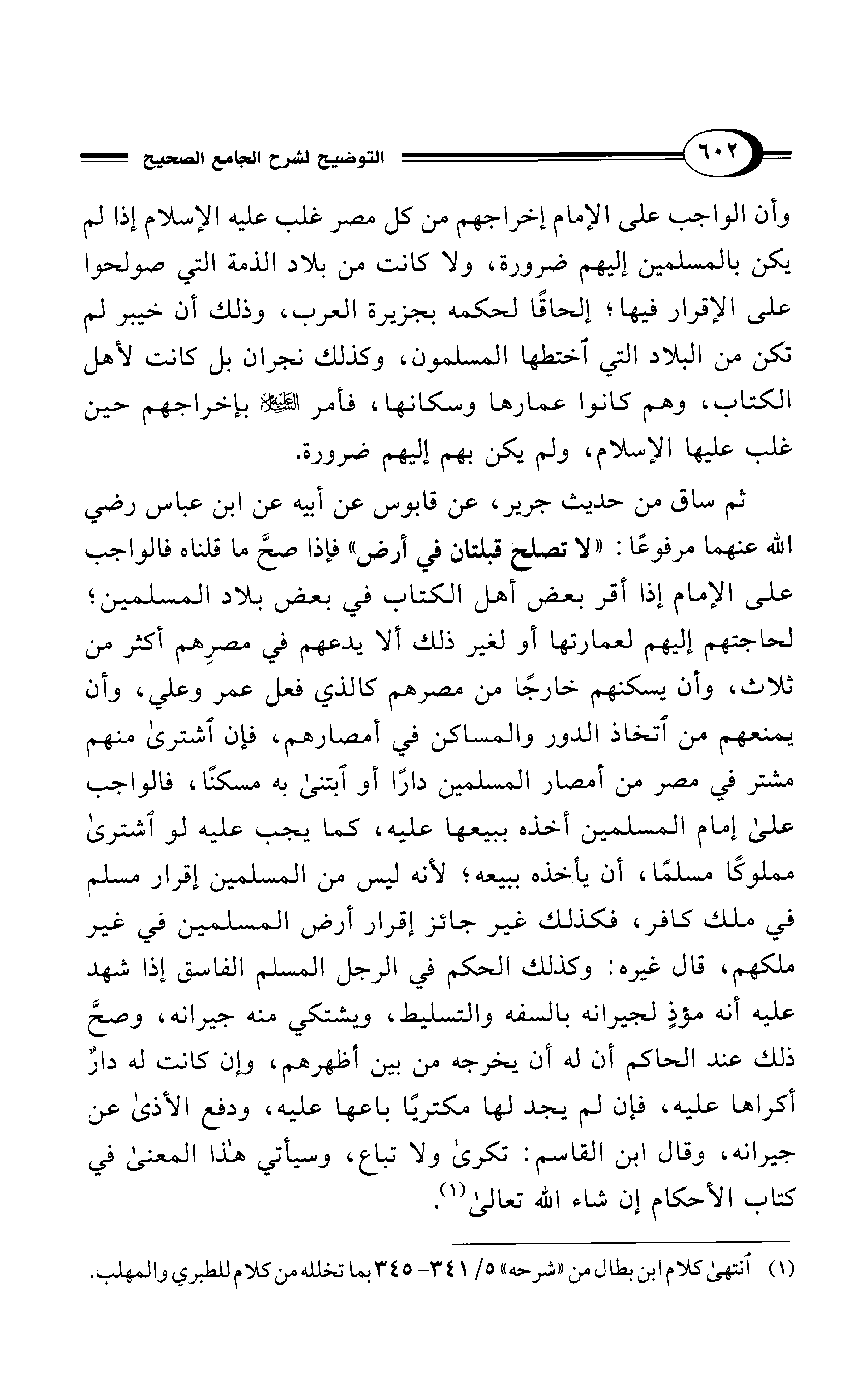 وأن الواجب على الإمام إخراجهم من كل مصر غلب عليه الإسلام إذا لم يكن بالمسلمين إليهم ضرورة، ولا كانت من بلاد الذمة التي صولحوا على الإقرار فيها؛ إلحاقًا لحكمه بجزيرة العرب، وذلك أن خيبر لم تكن من البلاد التي اختطها المسلمون، وكذلك نجران بل كانت لأهل الكتاب، وهم كانوا عمارها وسكانها، فأمر - عليه السلام - بإخراجهم حين غلب عليها الإسلام، ولم يكن بهم إليهم ضرورة.