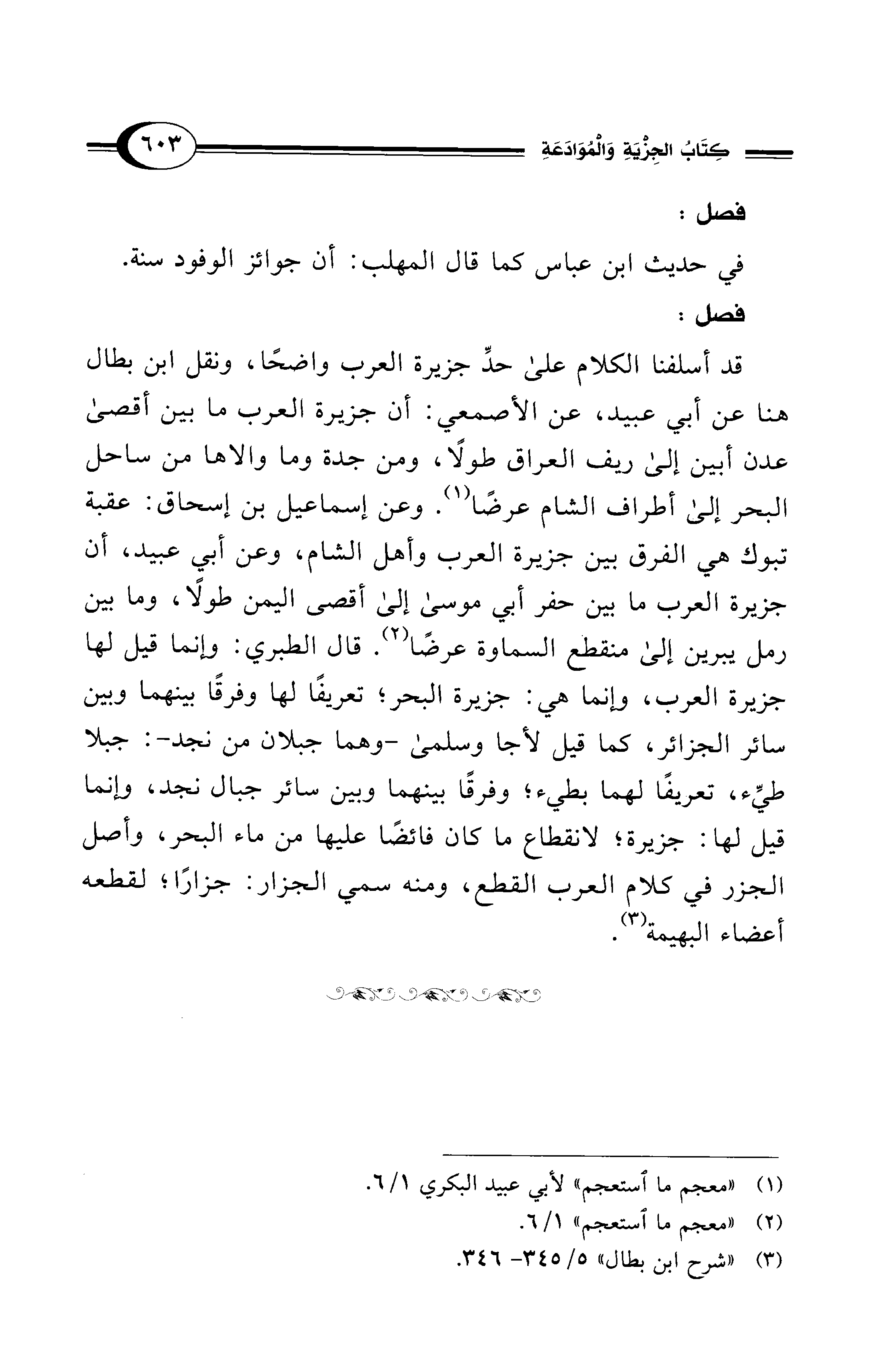 قد أسلفنا الكلام على حدِّ جزيرة العرب واضحًا، ونقل ابن بطال هنا عن أبي عبيد، عن الأصمعي: أن جزيرة العرب ما بين أقصى عدن أبين إلى ريف العراق طولاً، ومن جدة وما والاها من ساحل البحر إلى أطراف الشام عرضًا (¬1). وعن إسماعيل بن إسحاق: عقبة تبوك هي الفرق بين جزيرة العرب وأهل الشام، وعن أبي عبيد، أن جزيرة العرب ما بين حفر أبي موسى إلى أقصى اليمن طولاً، وما بين رمل يبرين إلى منقطع السماوة عرضًا (¬2). قال الطبري: وإنما قيل لها جزيرة العرب، وإنما هي: جزيرة البحر؛ تعريفًا لها وفرقًا بينهما وبين سائر الجزائر، كما قيل لأجا وسلمى -وهما جبلان من نجد-: جبلا طيّء، تعريفًا لهما بطيء؛ وفرقًا بينهما وبين سائر جبال نجد، وإنما قيل لها: جزيرة؛ لانقطاع ما كان فائضًا عليها من ماء البحر، وأصل الجزر في كلام العرب القطع، ومنه سمي الجزار: جزارًا؛ لقطعه أعضاء البهيمة (¬3).