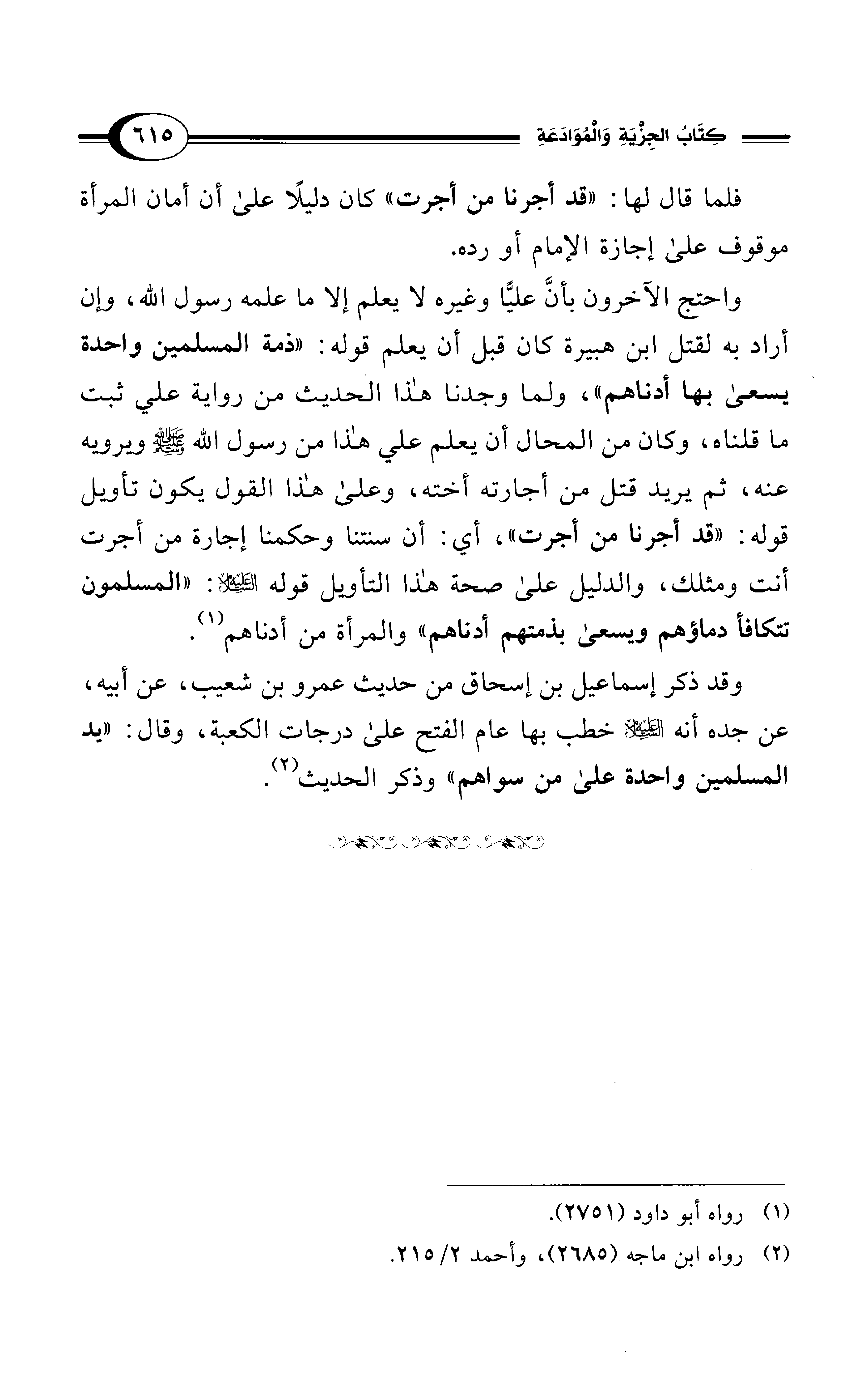 واحتج الآخرون بأنَّ عليًّا وغيره لا يعلم إلا ما علمه رسول الله، وإن أراد به لقتل ابن هبيرة كان قبل أن يعلم قوله: "ذمة المسلمين واحدة يسعى بها أدناهم"، ولما وجدنا هذا الحديث من رواية علي ثبت ما قلناه، وكان من المحال أن يعلم على هذا من رسول الله - صلى الله عليه وسلم - ويرويه عنه، ثم يريد قتل من أجارته أخته، وعلى هذا القول يكون تأويل قوله: "قد أجرنا من أجرت"، أي: أن سنتنا وحكمنا إجارة من أجرت أنت ومثلك، والدليل على صحة هذا التأويل قوله - عليه السلام -: "المسلمون تتكافأ دماؤهم ويسعى بذمتهم أدناهم" والمرأة من أدناهم (¬1).