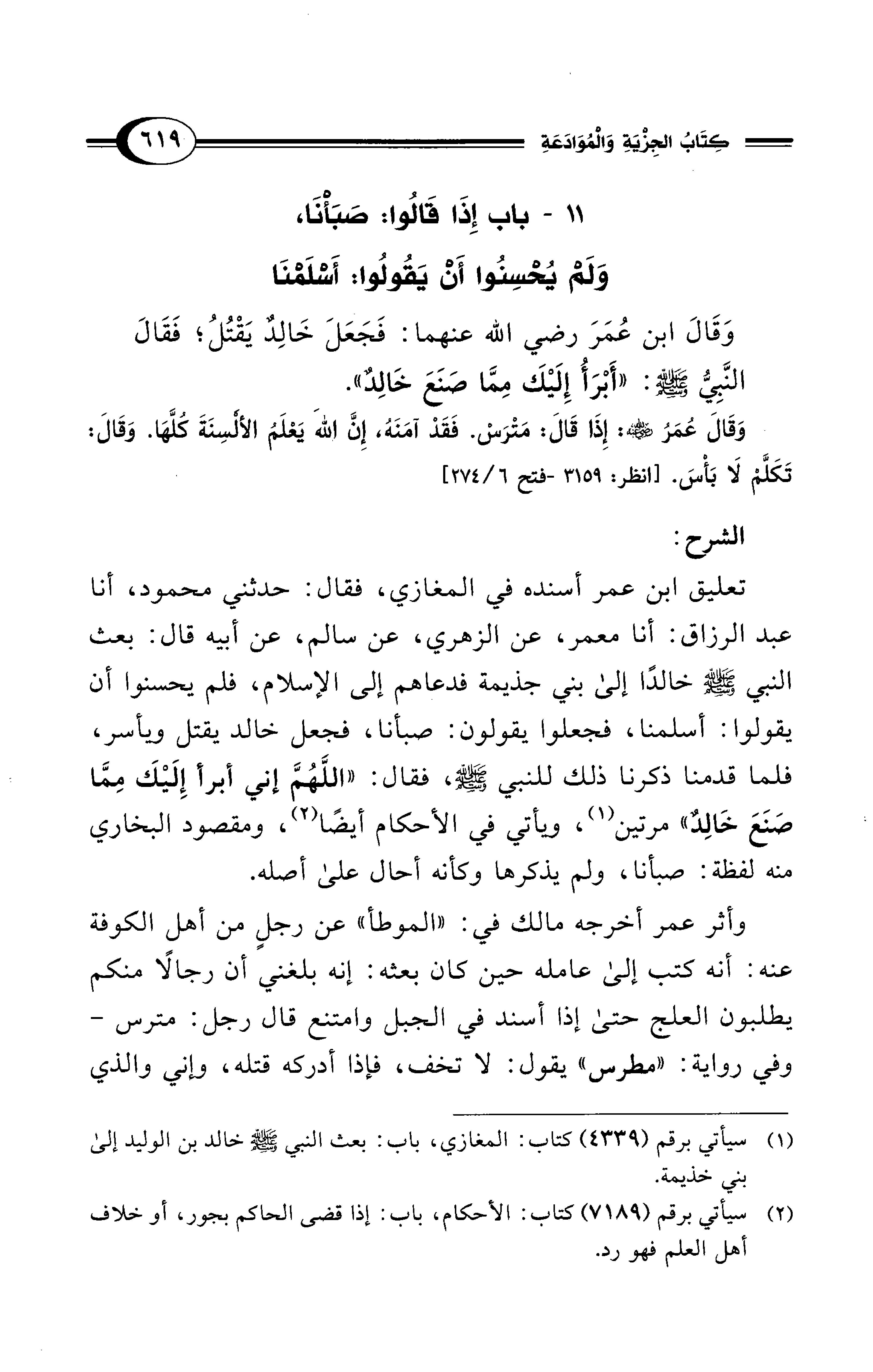وَقَالَ ابْنُ عُمَرَ - رضي الله عنهما -: فَجَعَلَ خَالِدٌ يَقْتُلُ؛ فَقَالَ النَّبِيُّ - صلى الله عليه وسلم -: «أَبْرَأُ إِلَيْكَ مِمَّا صَنَعَ خَالِدٌ».