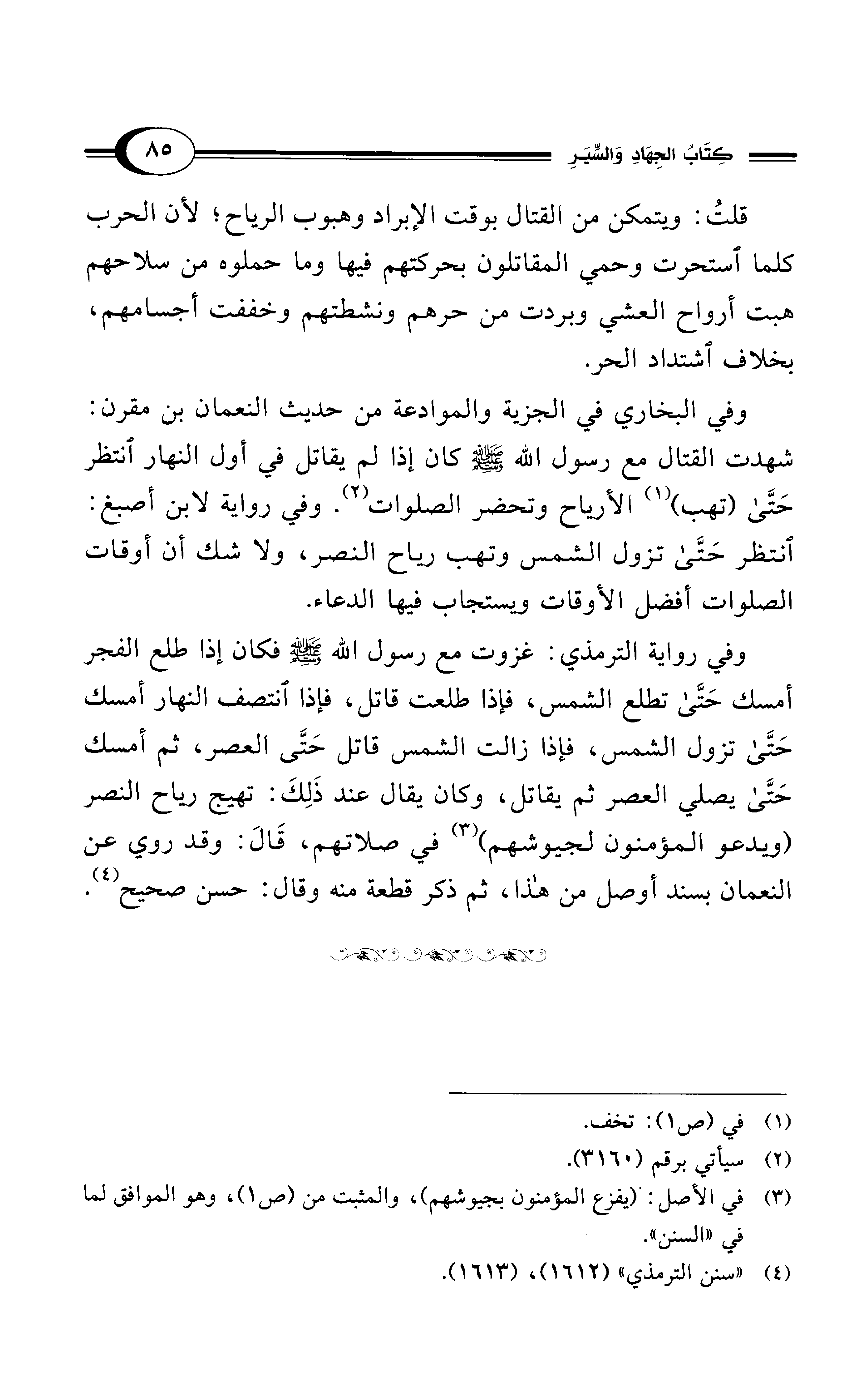 وفي رواية الترمذي: غزوت مع رسول الله - صلى الله عليه وسلم - فكان إذا طلع الفجر أمسك حَتَّى تطلع الشمس، فإذا طلعت قاتل، فإذا انتصف النهار أمسك حَتَّى تزول الشمس، فإذا زالت الشمس قاتل حَتَّى العصر، ثم أمسك حَتَّى يصلي العصر ثم يقاتل، وكان يقال عند ذَلِكَ: تهيج رياح النصر (ويدعو المؤمنون لجيوشهم) (¬3) في صلاتهم، قَالَ: وقد روي عن النعمان بسند أوصل من هذا، ثم ذكر قطعة منه وقال: حسن صحيح (¬4).