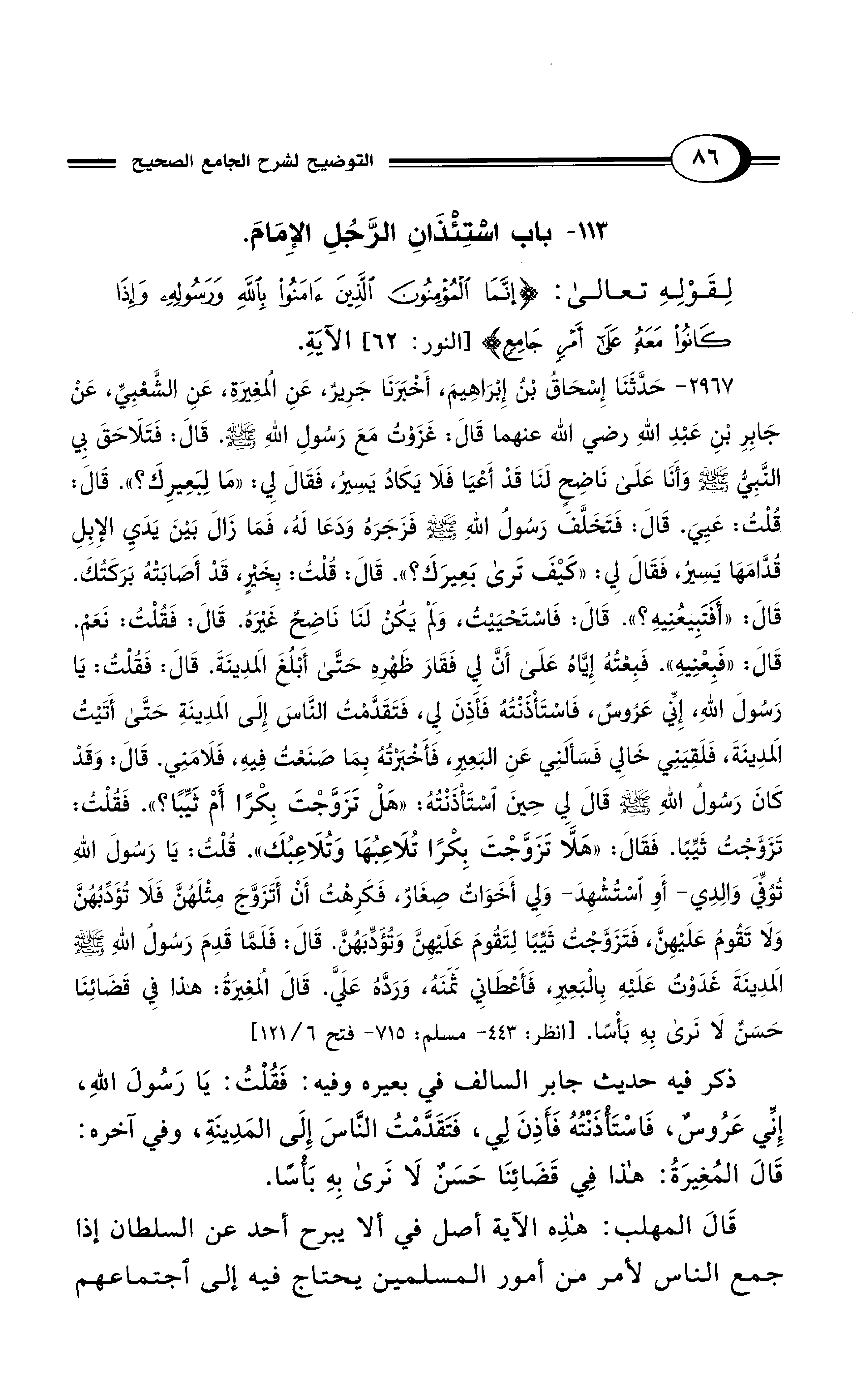 ذكر فيه حديث جابر السالف في بعيره وفيه: فَقُلْتُ: يَا رَسُولَ اللهِ، إِنِّي عَرُوسٌ، فَاسْتَأْذَنْتُهُ فَأَذِنَ لِي، فَتَقَدَّمْتُ النَّاسَ إِلَى المَدِينَةِ، وفي آخره: قَالَ المُغِيرَةُ: هذا في قَضَائِنَا حَسَن لَا نَرى بِهِ بَأْسًا.