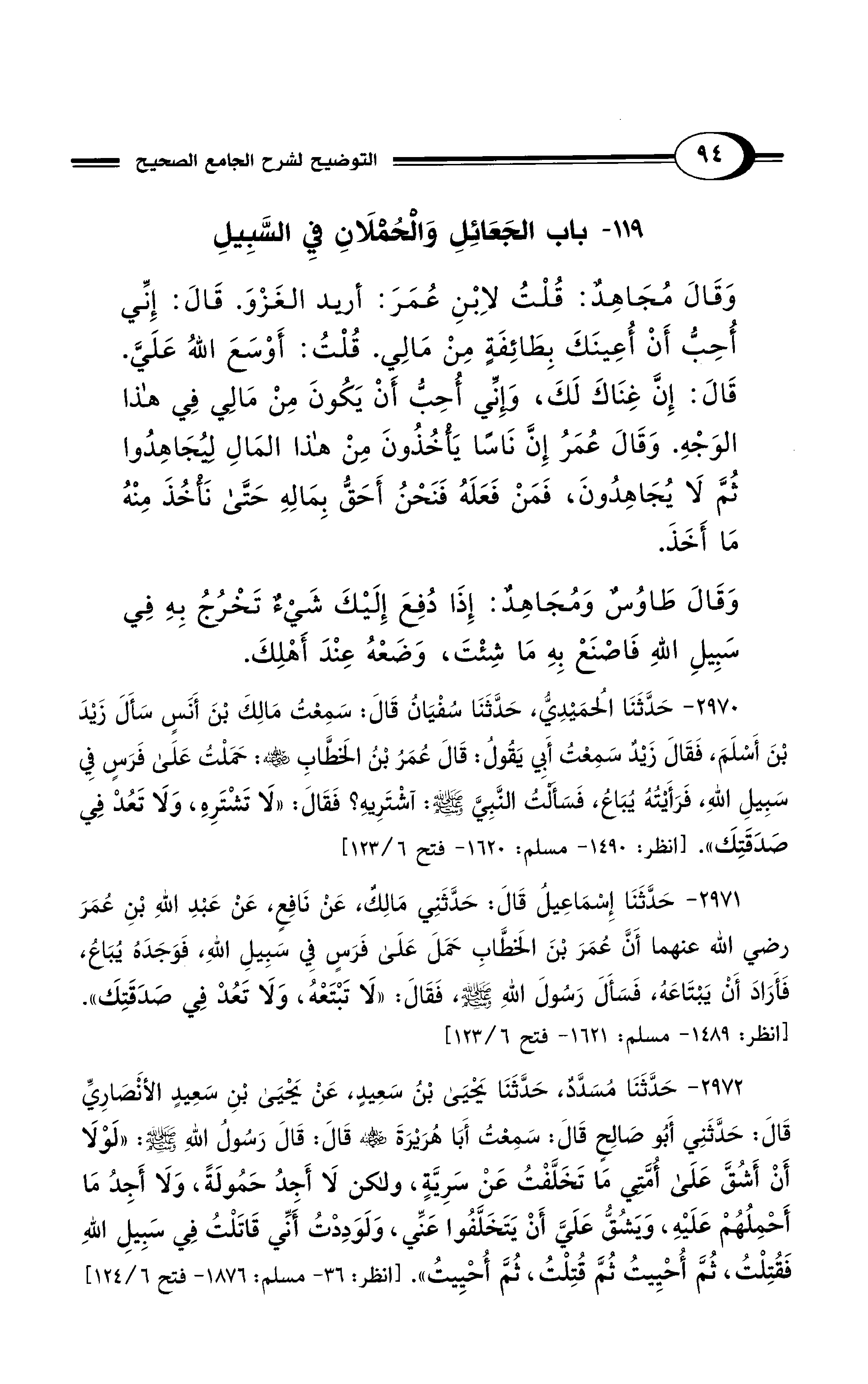 2970 - حَدَّثَنَا الحُمَيْدِيُّ، حَدَّثَنَا سُفْيَانُ قَالَ: سَمِعْتُ مَالِكَ بْنَ أَنَسٍ سَأَلَ زَيْدَ بْنَ أَسْلَمَ، فَقَالَ زَيْدٌ سَمِعْتُ أَبِي يَقُولُ: قَالَ عُمَرُ بْنُ الْخَطَّابِ - رضي الله عنه - حَمَلْتُ عَلَى فَرَسٍ فِي سَبِيلِ اللهِ، فَرَأَيْتُهُ يُبَاعُ، فَسَأَلْتُ النَّبِيَّ - صلى الله عليه وسلم -: آشْتَرِيهِ؟ فَقَالَ: «لاَ تَشْتَرِهِ، وَلاَ تَعُدْ فِي صَدَقَتِكَ». [انظر: 1490 - مسلم: 1620 - فتح 6/ 123]