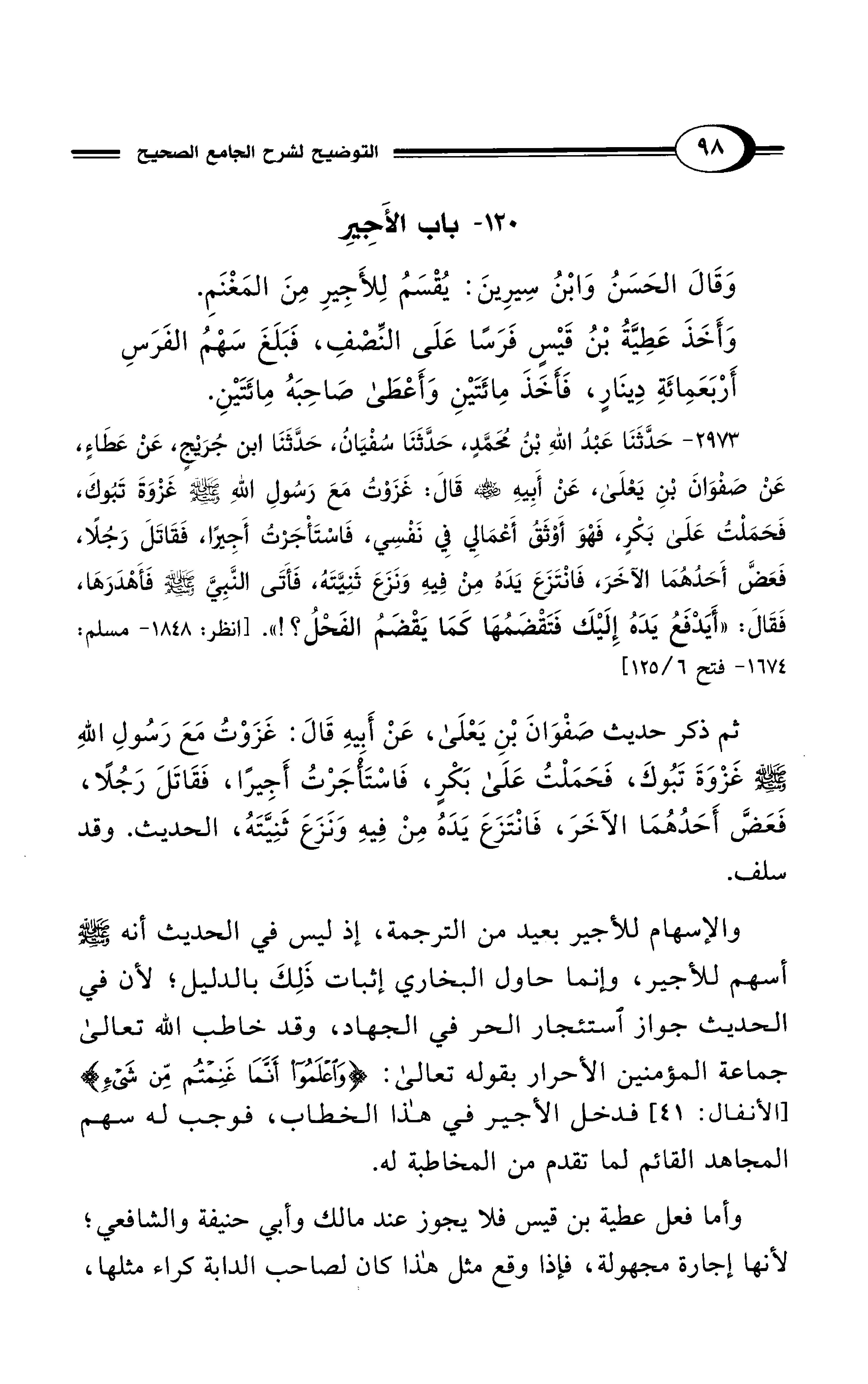 2173 - حَدَّثَنَا عَبْدُ اللهِ بْنُ مُحَمَّدٍ، حَدَّثَنَا سُفْيَانُ، حَدَّثَنَا ابْنُ جُرَيْجٍ، عَنْ عَطَاءٍ، عَنْ صَفْوَانَ بْنِ يَعْلَى، عَنْ أَبِيهِ - رضي الله عنه - قَالَ: غَزَوْتُ مَعَ رَسُولِ اللهِ - صلى الله عليه وسلم - غَزْوَةَ تَبُوكَ، فَحَمَلْتُ عَلَى بَكْرٍ، فَهْوَ أَوْثَقُ أَعْمَالِي فِي نَفْسِي، فَاسْتَأْجَرْتُ أَجِيرًا، فَقَاتَلَ رَجُلاً، فَعَضَّ أَحَدُهُمَا الآخَرَ فَانْتَزَعَ يَدَهُ مِنْ فِيهِ، وَنَزَعَ ثَنِيَّتَهُ، فَأَتَى النَّبِيَّ - صلى الله عليه وسلم - فَأَهْدَرَهَا فَقَالَ «أَيَدْفَعُ يَدَهُ إِلَيْكَ فَتَقْضَمُهَا كَمَا يَقْضَمُ الفَحْلُ؟!». [انظر: 1848 - مسلم: 1674 - فتح 6/ 125]