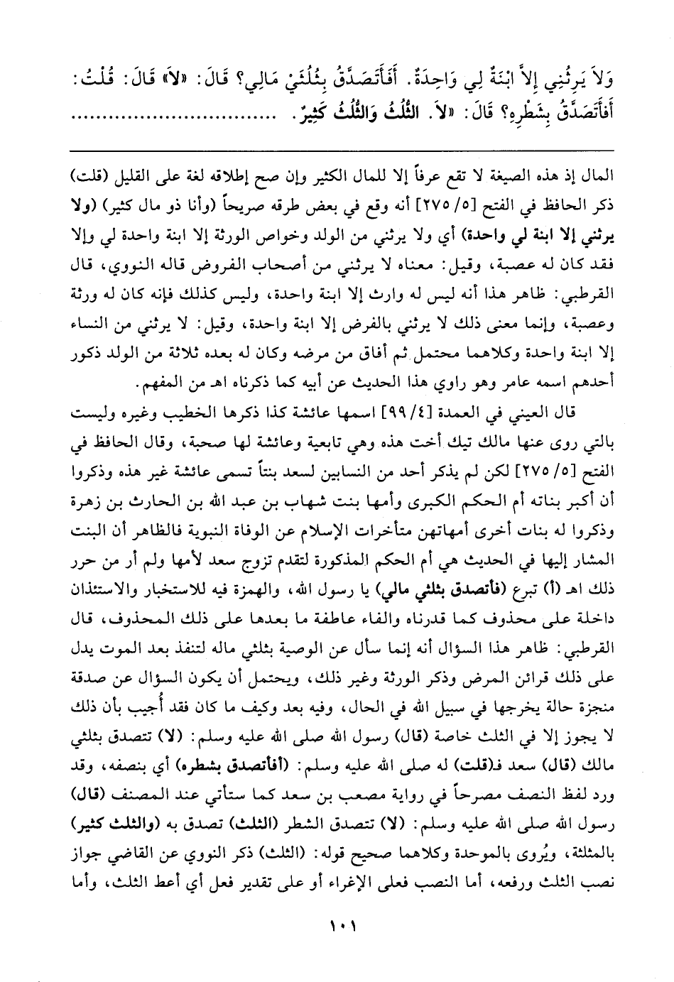 وَلَا يَرِثُنِي إلا ابْنَةٌ لِي وَاحِدَةٌ. أَفَأَتَصدَّقُ بِثُلُثَي مَالِي؟ قَال: "لَا" قَال: قُلْتُ: أَفأَتَصَدَّقُ بِشَطْرِهِ؟ قَال: "لَا. الثَّلُثُ وَالثَّلُثُ كَثِيرٌ