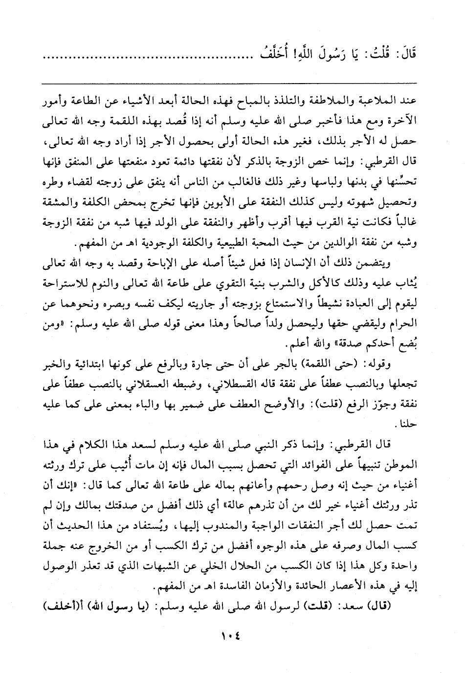 عند الملاعبة والملاطفة والتلذذ بالمباح فهذه الحالة أبعد الأشياء عن الطاعة وأمور الآخرة ومع هذا فأخبر صلى الله عليه وسلم أنَّه إذا قُصد بهذه اللقمة وجه الله تعالى حصل له الأجر بذلك، فغير هذه الحالة أولى بحصول الأجر إذا أراد وجه الله تعالى، قال القرطبي: وإنما خص الزوجة بالذكر لأن نفقتها دائمة تعود منفعتها على المنفق فإنها تحسِّنها في بدنها ولباسها وغير ذلك فالغالب من الناس أنَّه ينفق على زوجته لقضاء وطره وتحصيل شهوته وليس كذلك النفقة على الأبوين فإنها تخرج بمحض الكلفة والمشقة غالبًا فكانت نية القرب فيها أقرب وأظهر والنفقة على الولد فيها شبه من نفقة الزوجة وشبه من نفقة الوالدين من حيث المحبة الطبيعية والكلفة الوجودية اهـ من المفهم.