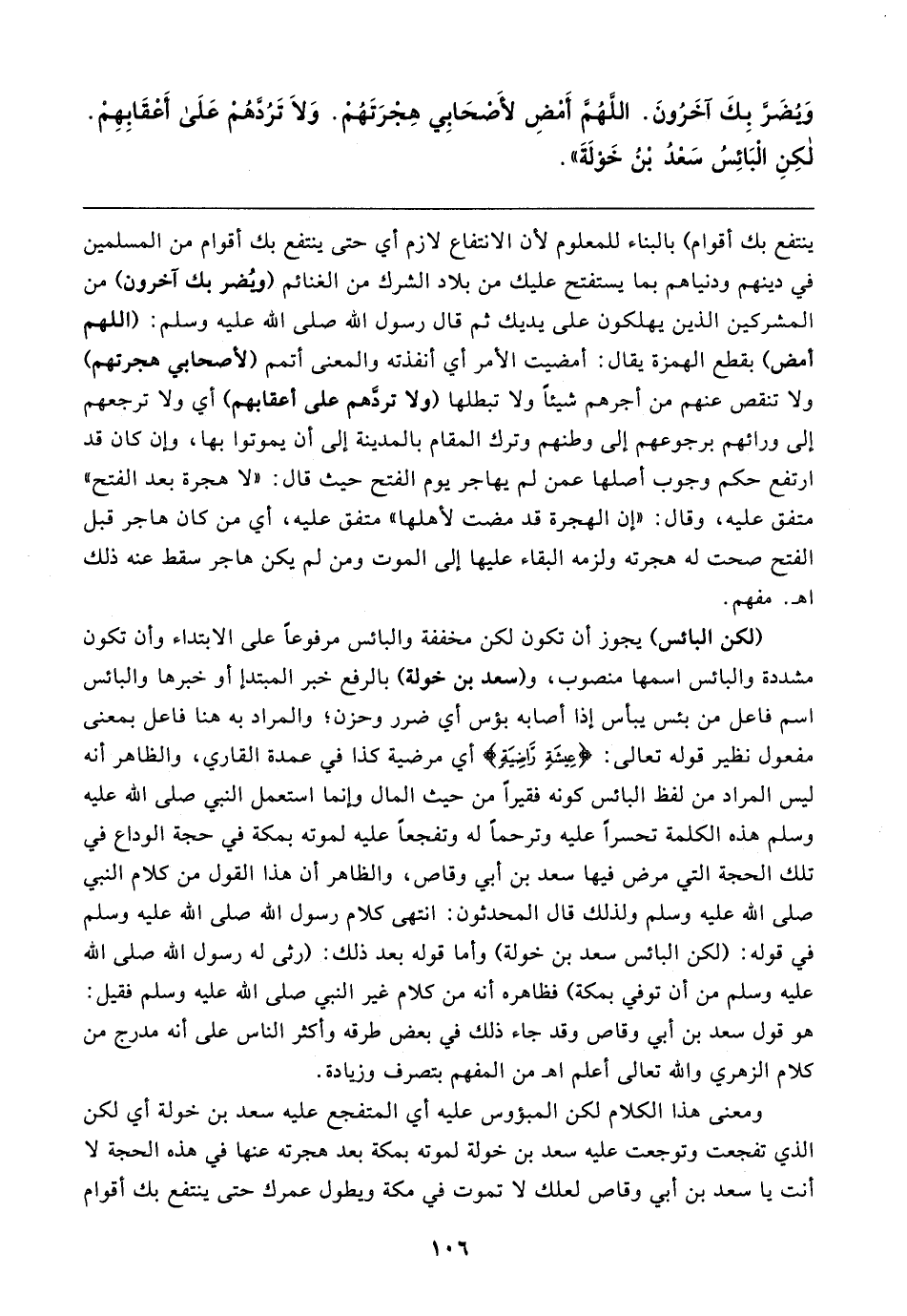 وَيُضَرَّ بِكَ آخَرُونَ. اللَّهُمَّ أَمْضِ لأَصْحَابِي هِجْرَتَهُمْ. وَلَا تَرُدَّهُمْ عَلَى أَعْقَابِهِمْ. لكِنِ الْبَائِسُ سَعْدُ بْنُ خَوْلَةَ"