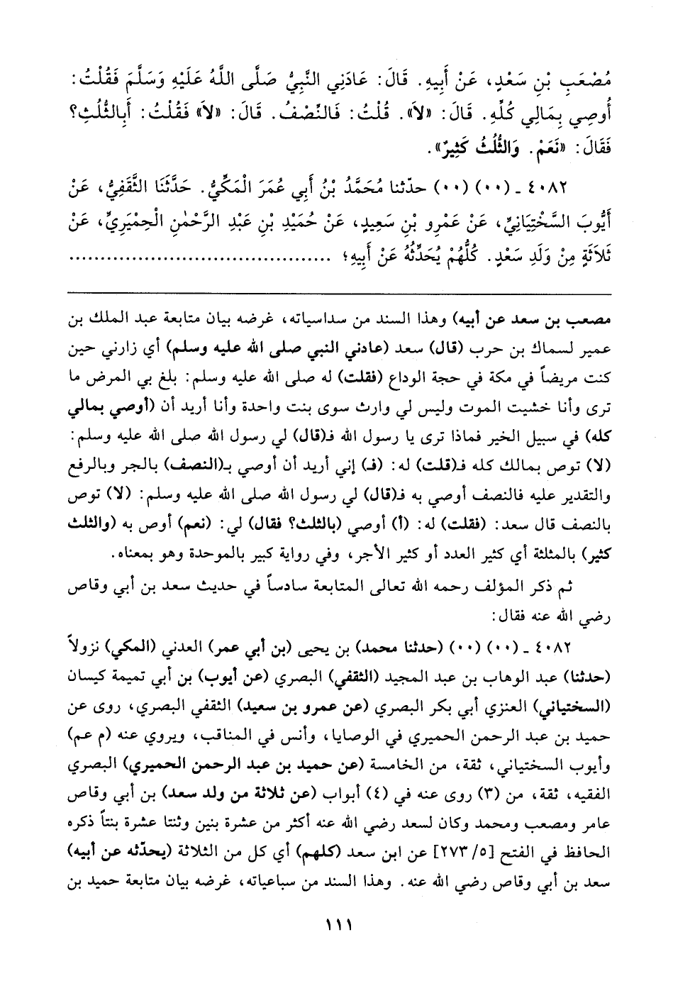 مُصْعَبِ بْنِ سَعْدٍ، عَنْ أَبِيهِ. قَال: عَادَنِي النَّبِيُّ صَلَّى اللهُ عَلَيهِ وَسَلَّمَ فَقُلْتُ: أُوصِي بِمَالِي كُلِّهِ. قَال: "لَا". قُلْتُ: فَالنِّصْفُ. قَال: "لَا" فَقُلْتُ: أَبِالثُّلُثِ؟ فَقَال: "نَعَمْ. وَالثُّلُثُ كَثِيرٌ".