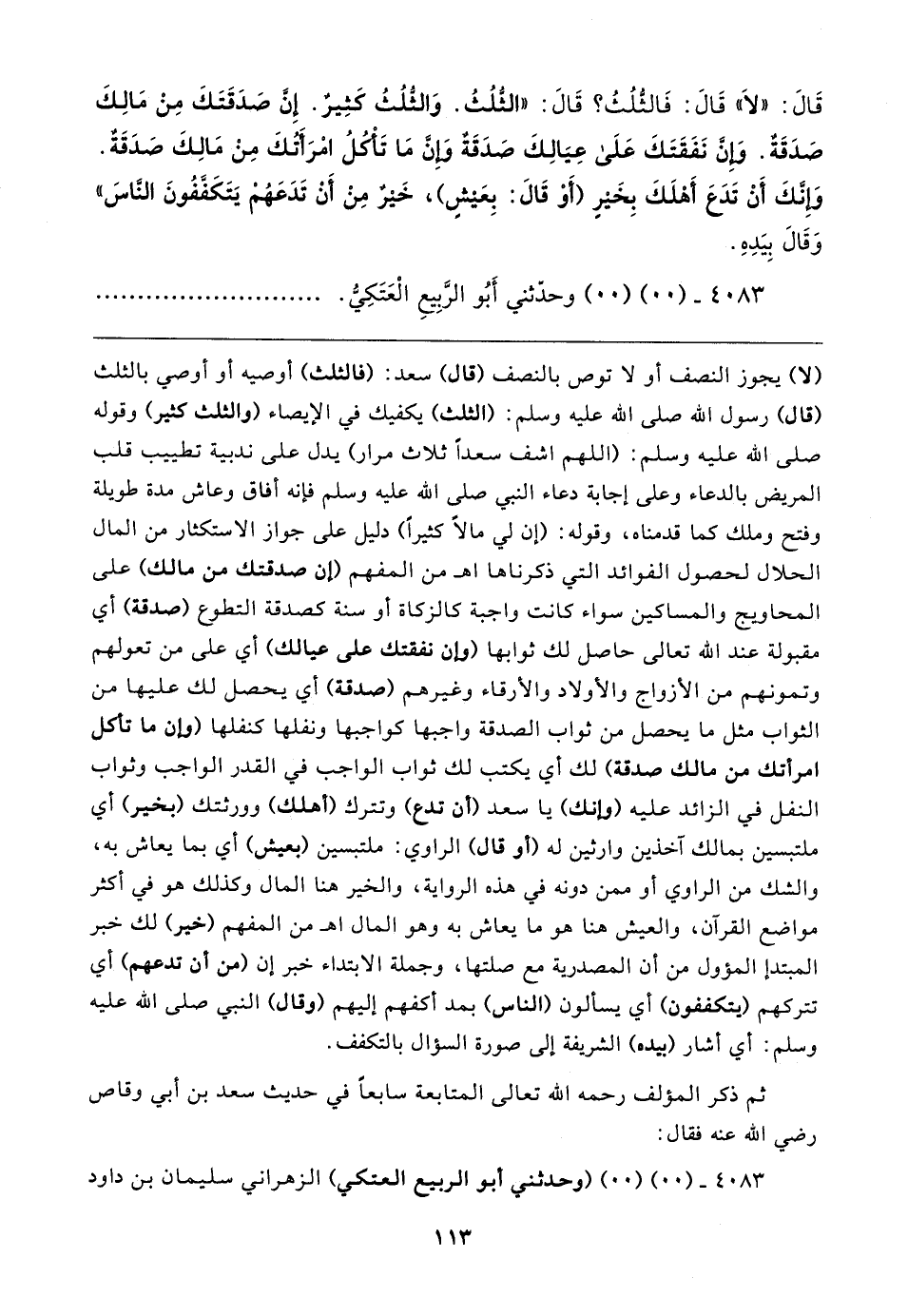 قَال: "لَا" قَال: فَالثُّلُثُ؟ قَال: "الثُّلُثُ. وَالثُّلُثُ كَثِيرٌ. إِنَّ صَدَقَتَكَ مِنْ مَالِكَ صَدَقَةٌ. وَإِنَّ نَفَقَتَكَ عَلَى عِيَالِكَ صَدَقَةٌ وَإِنَّ مَا تَأْكُلُ امْرَأَتُكَ مِنْ مَالِكَ صَدَقَةٌ. وَإِنَّكَ أَنْ تَدَعَ أَهْلَكَ بِخَيرٍ (أَوْ قَال: بِعَيشٍ)، خَيرٌ مِنْ أَنْ تَدَعَهُمْ يَتَكَفَّفُونَ النَّاسَ" وَقَال بِيَدِهِ.