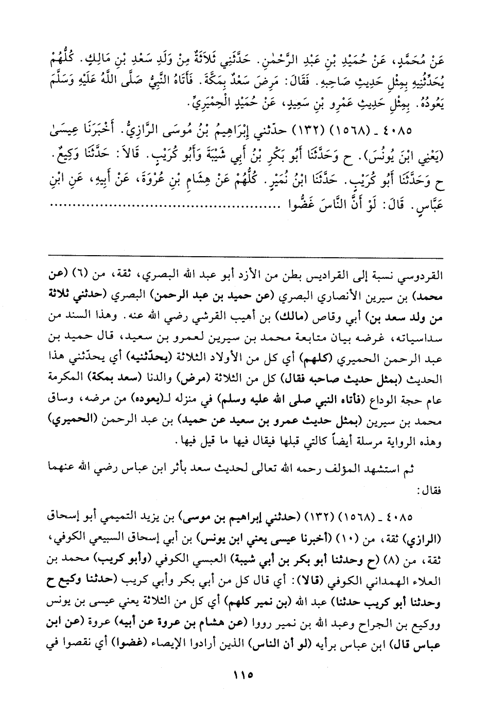 القردوسي نسبة إلى القراديس بطن من الأزد أبو عبد الله البصري، ثقة، من (٦) (عن محمد) بن سيرين الأنصاري البصري (عن حميد بن عبد الرحمن) البصري (حدثني ثلاثة من ولد سعد بن) أبي وقاص (مالك) بن أهيب القرشي رضي الله عنه. وهذا السند من سداسياته، غرضه بيان متابعة محمد بن سيرين لعمرو بن سعيد، قال حميد بن عبد الرحمن الحميري (كلهم) أي كل من الأولاد الثلاثة (يحدّثنيه) أي يحدّثني هذا الحديث (بمثل حديث صاحبه فقال) كل من الثلاثة (مرض) والدنا (سعد بمكة) المكرمة عام حجة الوداع (فأتاه النبي صلى الله عليه وسلم) في منزله لي (يعوده) من مرضه، وساق محمد بن سيرين (بمثل حديث عمرو بن سعيد عن حميد) بن عبد الرحمن (الحميري) وهذه الرواية مرسلة أيضًا كالتي قبلها فيقال فيها ما قيل فيها.