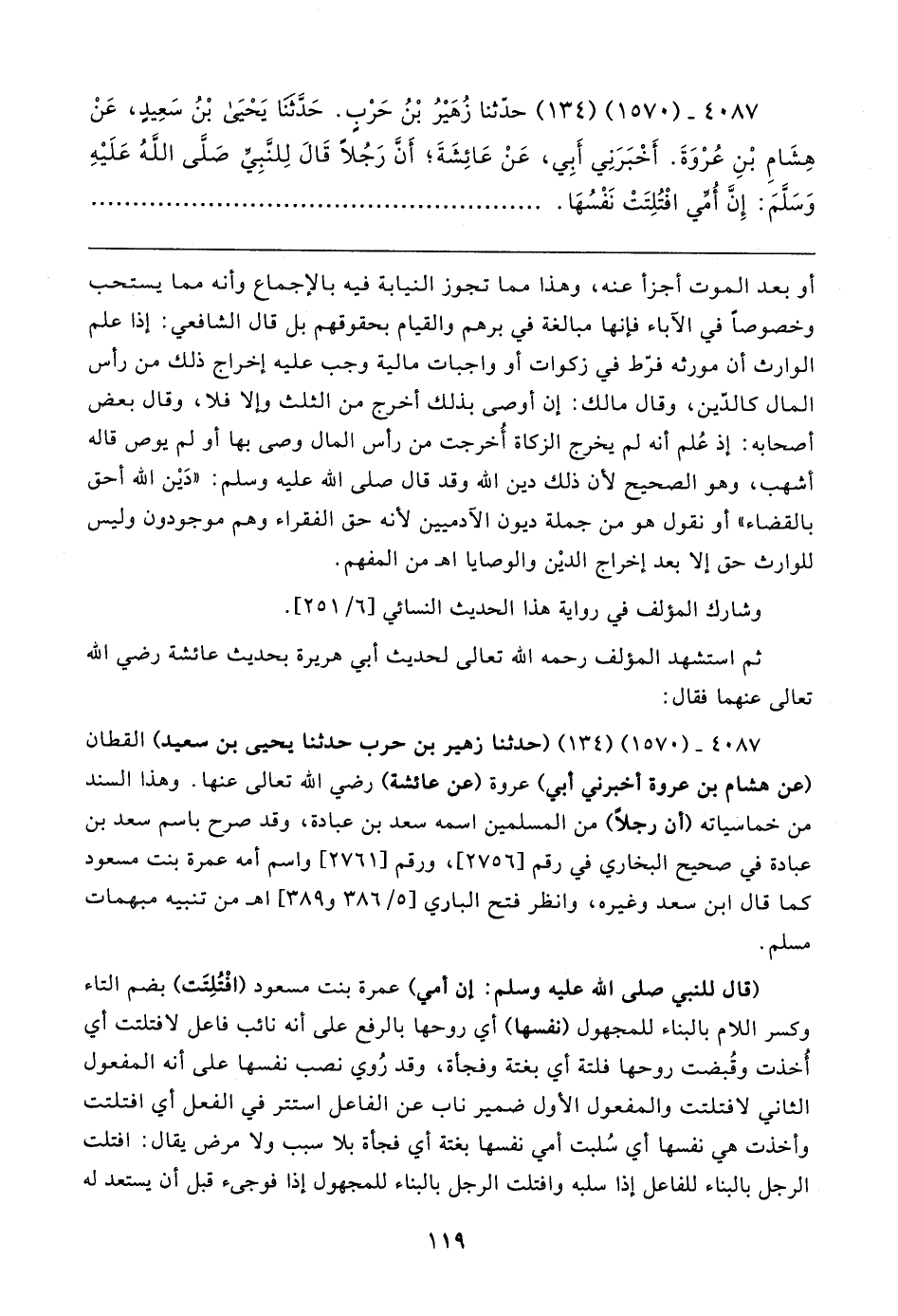 ٤٠٨٧ - (١٥٧٠) (١٣٤) حدَّثنا زُهَيرُ بْنُ حَرْبٍ. حَدَّثنَا يَحْيَى بْنُ سَعِيدٍ، عَنْ هِشَامِ بْنِ عُرْوَةَ. أَخْبَرَنِي أَبِي، عَنْ عَائِشَةَ؛ أَنَّ رَجُلًا قَال لِلنَّبِيِّ صَلَّى اللَّهُ عَلَيهِ وَسَلَّمَ: إِنَّ أُمِّي افْتُلِتَتْ نَفْسُهَا
