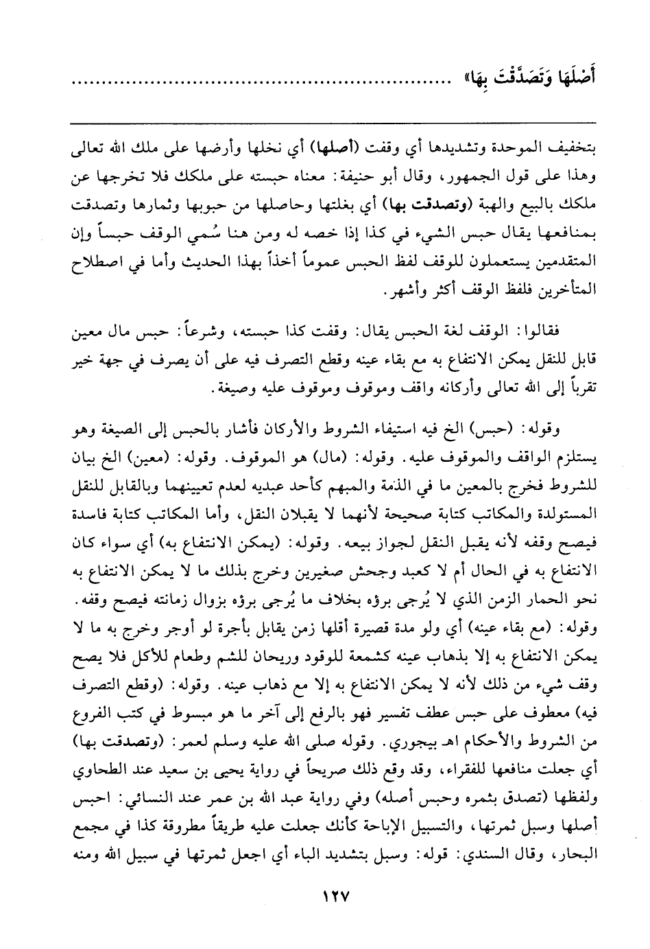 وقوله: (حبس) الخ فيه استيفاء الشروط والأركان فأشار بالحبس إلى الصيغة وهو يستلزم الواقف والموقوف عليه. وقوله: (مال) هو الموقوف. وقوله: (معين) الخ بيان للشروط فخرج بالمعين ما في الذمة والمبهم كأحد عبديه لعدم تعيينهما وبالقابل للنقل المستولدة والمكاتب كتابة صحيحة لأنهما لا يقبلان النقل، وأما المكاتب كتابة فاسدة فيصح وقفه لأنه يقبل النقل لجواز بيعه. وقوله: (يمكن الانتفاع به) أي سواء كان الانتفاع به في الحال أم لا كعبد وجحش صغيرين وخرج بذلك ما لا يمكن الانتفاع به نحو الحمار الزمن الذي لا يُرجى برؤه بخلاف ما يُرجى برؤه بزوال زمانته فيصح وقفه. وقوله: (مع بقاء عينه) أي ولو مدة قصيرة أقلها زمن يقابل بأجرة لو أوجر وخرج به ما لا يمكن الانتفاع به إلا بذهاب عينه كشمعة للوقود وريحان للشم وطعام للأكل فلا يصح وقف شيء من ذلك لأنه لا يمكن الانتفاع به إلا مع ذهاب عينه. وقوله: (وقطع التصرف فيه) معطوف على حبس عطف تفسير فهو بالرفع إلى آخر ما هو مبسوط في كتب الفروع من الشروط والأحكام اهـ بيجوري. وقوله صلى الله عليه وسلم لعمر: (وتصدقت بها) أي جعلت منافعها للفقراء، وقد وقع ذلك صريحًا في رواية يحيى بن سعيد عند الطحاوي ولفظها (تصدق بثمره وحبس أصله) وفي رواية عبد الله بن عمر عند النسائي: احبس أصلها وسبل ثمرتها، والتسبيل الإباحة كأنك جعلت عليه طريقًا مطروقة كذا في مجمع البحار، وقال السندي: قوله: وسبل بتشديد الباء أي اجعل ثمرتها في سبيل الله ومنه
